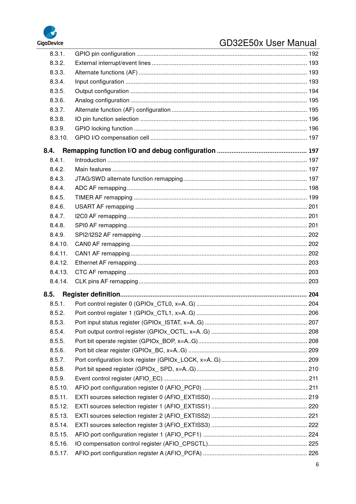 link to page 192 link to page 193 link to page 193 link to page 193 link to page 194 link to page 195 link to page 195 link to page 196 link to page 196 link to page 197 link to page 197 link to page 197 link to page 197 link to page 197 link to page 198 link to page 199 link to page 201 link to page 201 link to page 201 link to page 202 link to page 202 link to page 202 link to page 203 link to page 203 link to page 203 link to page 204 link to page 204 link to page 206 link to page 207 link to page 208 link to page 208 link to page 209 link to page 209 link to page 210 link to page 211 link to page 211 link to page 219 link to page 220 link to page 221 link to page 222 link to page 224 link to page 225 link to page 226 GD32E50x User Manual 8.3.1. GPIO pin configuration ... 192 8.3.2. External interrupt/event lines .. 193 8.3.3. Alternate functions (AF) .. 193 8.3.4. Input configuration .. 193 8.3.5. Output configuration ... 194 8.3.6. Analog configuration ... 195 8.3.7. Alternate function (AF) configuration .. 195 8.3.8. IO pin function selection ... 196 8.3.9. GPIO locking function ... 196 8.3.10. GPIO I/O compensation cell ... 197
