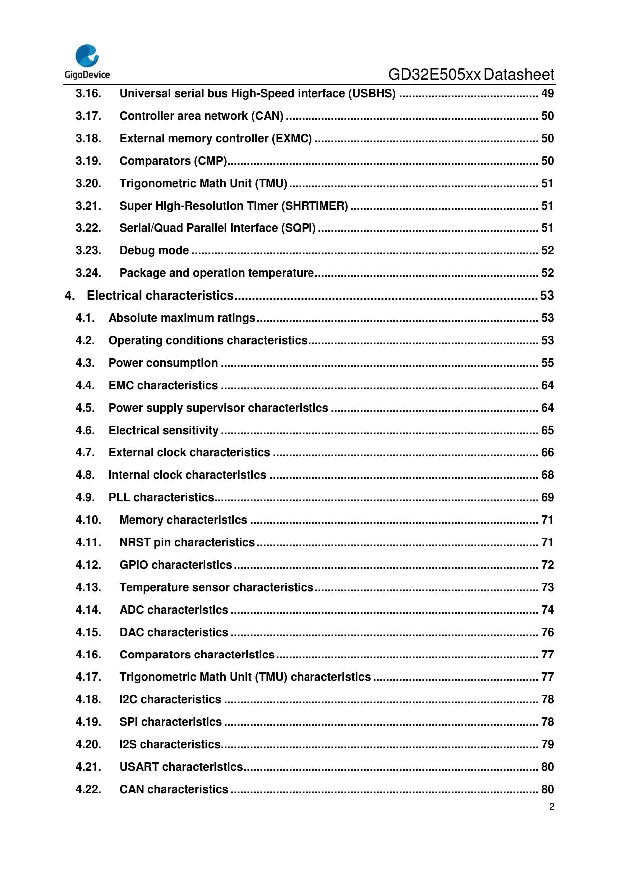 link to page 50 link to page 51 link to page 51 link to page 51 link to page 52 link to page 52 link to page 52 link to page 53 link to page 53 link to page 54 link to page 54 link to page 54 link to page 56 link to page 65 link to page 65 link to page 66 link to page 67 link to page 69 link to page 70 link to page 72 link to page 72 link to page 73 link to page 74 link to page 75 link to page 77 link to page 78 link to page 78 link to page 79 link to page 79 link to page 80 link to page 81 link to page 81 GD32E505xx Datasheet 3.16.Universal serial bus High-Speed interface (USBHS) ... 493.17.Controller area network (CAN) .. 503.18.External memory controller (EXMC) ... 503.19.Comparators (CMP) .. 503.20.Trigonometric Math Unit (TMU) ... 513.21.Super High-Resolution Timer (SHRTIMER) .. 513.22.Serial/Quad Parallel Interface (SQPI) .. 513.23.Debug mode ... 523.24.Package and operation temperature ... 524.Electrical characteristics ... 534.1.Absolute maximum ratings ... 534.2.Operating conditions characteristics ... 534.3.Power consumption .. 554.4.EMC characteristics .. 644.5.Power supply supervisor characteristics .. 644.6.Electrical sensitivity .. 654.7.External clock characteristics .. 664.8.Internal clock characteristics ... 684.9.PLL characteristics.. 694.10.Memory characteristics ... 714.11.NRST pin characteristics ... 714.12.GPIO characteristics .. 724.13.Temperature sensor characteristics ... 734.14.ADC characteristics ... 744.15.DAC characteristics ... 764.16.Comparators characteristics ... 774.17.Trigonometric Math Unit (TMU) characteristics ... 774.18.I2C characteristics ... 784.19.SPI characteristics ... 784.20.I2S characteristics.. 794.21.USART characteristics ... 804.22.CAN characteristics ... 80 2 Document Outline Table of Contents List of Figures List of Tables 1. General description 2. Device overview 2.1. Device information 2.2. Block diagram 2.3. Pinouts and pin assignment 2.4. Memory map 2.5. Clock tree 2.6. Pin definitions 2.6.1. GD32E505Zx LQFP144 pin definitions 2.6.2. GD32E505Vx LQFP100 pin definitions 2.6.3. GD32E505Rx LQFP64 pin definitions 3. Functional description 3.1. Arm® Cortex®-M33 core 3.2. Embedded memory 3.3. Clock, reset and supply management 3.4. Boot modes 3.5. Power saving modes 3.6. Analog to digital converter (ADC) 3.7. Digital to analog converter (DAC) 3.8. DMA 3.9. General-purpose inputs/outputs (GPIOs) 3.10. Timers and PWM generation 3.11. Real time clock (RTC) 3.12. Inter-integrated circuit (I2C) 3.13. Serial peripheral interface (SPI) 3.14. Universal synchronous asynchronous receiver transmitter (USART) 3.15. Inter-IC sound (I2S) 3.16. Universal serial bus High-Speed interface (USBHS) 3.17. Controller area network (CAN) 3.18. External memory controller (EXMC) 3.19. Comparators (CMP) 3.20. Trigonometric Math Unit (TMU) 3.21. Super High-Resolution Timer (SHRTIMER) 3.22. Serial/Quad Parallel Interface (SQPI) 3.23. Debug mode 3.24. Package and operation temperature 4. Electrical characteristics 4.1. Absolute maximum ratings 4.2. Operating conditions characteristics 4.3. Power consumption 4.4. EMC characteristics 4.5. Power supply supervisor characteristics 4.6. Electrical sensitivity 4.7. External clock characteristics 4.8. Internal clock characteristics 4.9. PLL characteristics 4.10. Memory characteristics 4.11. NRST pin characteristics 4.12. GPIO characteristics 4.13. Temperature sensor characteristics 4.14. ADC characteristics 4.15. DAC characteristics 4.16. Comparators characteristics 4.17. Trigonometric Math Unit (TMU) characteristics 4.18. I2C characteristics 4.19. SPI characteristics 4.20. I2S characteristics 4.21. USART characteristics 4.22. CAN characteristics 4.23. USBHS characteristics 4.24. EXMC characteristics 4.25. Serial/Quad Parallel Interface (SQPI) characteristics 4.26. Super High-Resolution Timer (SHRTIMER) characteristics 4.27. TIMER characteristics 4.28. WDGT characteristics 4.29. Parameter condition 5. Package information 5.1. LQFP144 package outline dimensions 5.2. LQFP100 package outline dimensions 5.3. LQFP64 package outline dimensions 6. Ordering information 7. Revision history