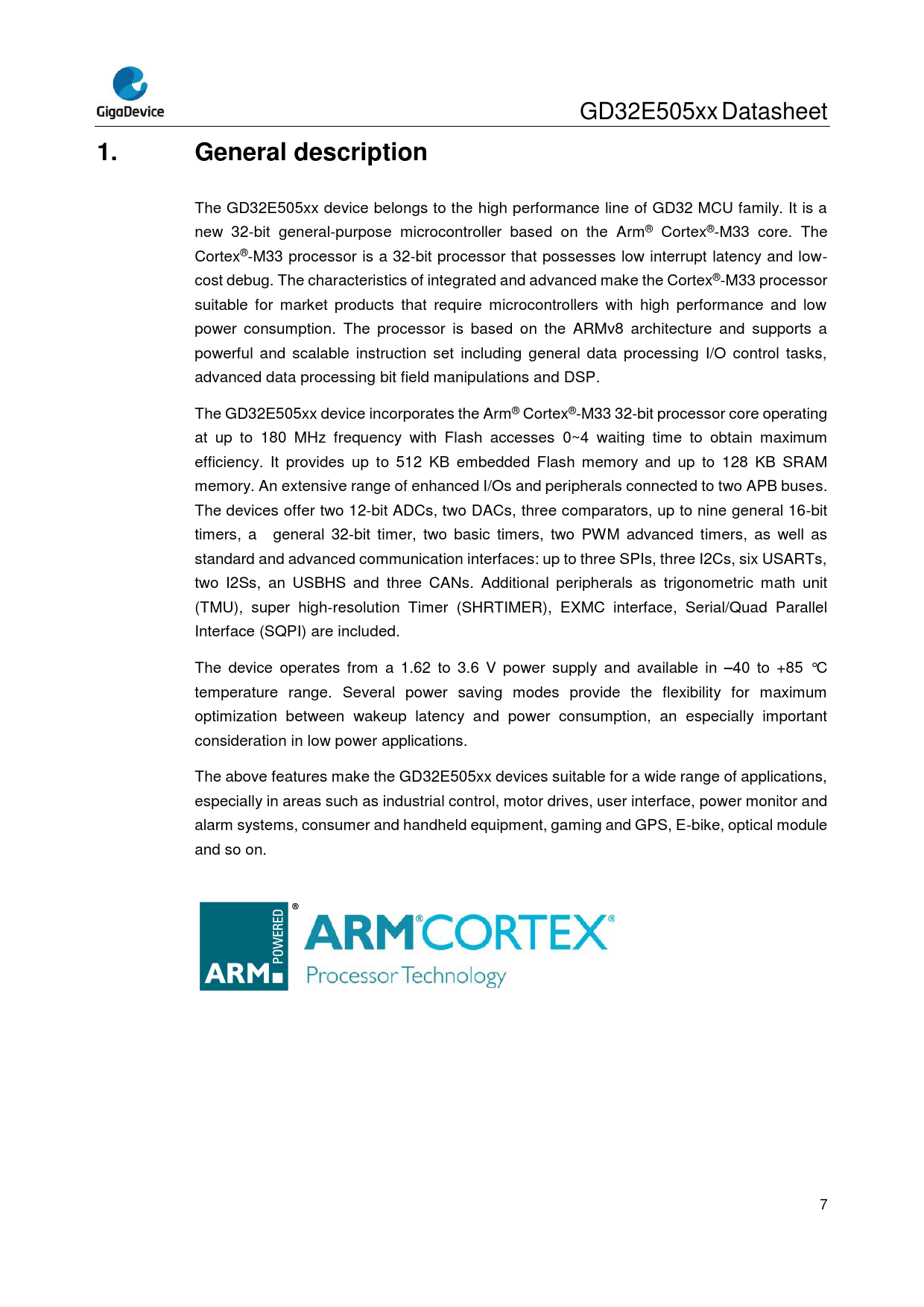 The GD32E505xx device belongs to the high performance line of GD32 MCU family. It is a new 32-bit general-purpose microcontroller based on the Arm® Cortex®-M33 core. The Cortex®-M33 processor is a 32-bit processor that possesses low interrupt latency and low- cost debug. The characteristics of integrated and advanced make the Cortex®-M33 processor suitable for market products that require microcontrollers with high performance and low power consumption. The processor is based on the ARMv8 architecture and supports a powerful and scalable instruction set including general data processing I/O control tasks, advanced data processing bit field manipulations and DSP. The GD32E505xx device incorporates the Arm® Cortex®-M33 32-bit processor core operating at up to 180 MHz frequency with Flash accesses 0~4 waiting time to obtain maximum efficiency. It provides up to 512 KB embedded Flash memory and up to 128 KB SRAM memory. An extensive range of enhanced I/Os and peripherals connected to two APB buses. The devices offer two 12-bit ADCs, two DACs, three comparators, up to nine general 16-bit timers, a general 32-bit timer, two basic timers, two PWM advanced timers, as well as standard and advanced communication interfaces: up to three SPIs, three I2Cs, six USARTs, two I2Ss, an USBHS and three CANs. Additional peripherals as trigonometric math unit (TMU), super high-resolution Timer (SHRTIMER), EXMC interface, Serial/Quad Parallel Interface (SQPI) are included. The device operates from a 1.62 to 3.6 V power supply and available in –40 to +85 °C temperature range. Several power saving modes provide the flexibility for maximum optimization between wakeup latency and power consumption, an especially important consideration in low power applications. The above features make the GD32E505xx devices suitable for a wide range of applications, especially in areas such as industrial control, motor drives, user interface, power monitor and alarm systems, consumer and handheld equipment, gaming and GPS, E-bike, optical module and so on. 7 Document Outline Table of Contents List of Figures List of Tables 1. General description 2. Device overview 2.1. Device information 2.2. Block diagram 2.3. Pinouts and pin assignment 2.4. Memory map 2.5. Clock tree 2.6. Pin definitions 2.6.1. GD32E505Zx LQFP144 pin definitions 2.6.2. GD32E505Vx LQFP100 pin definitions 2.6.3. GD32E505Rx LQFP64 pin definitions 3. Functional description 3.1. Arm® Cortex®-M33 core 3.2. Embedded memory 3.3. Clock, reset and supply management 3.4. Boot modes 3.5. Power saving modes 3.6. Analog to digital converter (ADC) 3.7. Digital to analog converter (DAC) 3.8. DMA 3.9. General-purpose inputs/outputs (GPIOs) 3.10. Timers and PWM generation 3.11. Real time clock (RTC) 3.12. Inter-integrated circuit (I2C) 3.13. Serial peripheral interface (SPI) 3.14. Universal synchronous asynchronous receiver transmitter (USART) 3.15. Inter-IC sound (I2S) 3.16. Universal serial bus High-Speed interface (USBHS) 3.17. Controller area network (CAN) 3.18. External memory controller (EXMC) 3.19. Comparators (CMP) 3.20. Trigonometric Math Unit (TMU) 3.21. Super High-Resolution Timer (SHRTIMER) 3.22. Serial/Quad Parallel Interface (SQPI) 3.23. Debug mode 3.24. Package and operation temperature 4. Electrical characteristics 4.1. Absolute maximum ratings 4.2. Operating conditions characteristics 4.3. Power consumption 4.4. EMC characteristics 4.5. Power supply supervisor characteristics 4.6. Electrical sensitivity 4.7. External clock characteristics 4.8. Internal clock characteristics 4.9. PLL characteristics 4.10. Memory characteristics 4.11. NRST pin characteristics 4.12. GPIO characteristics 4.13. Temperature sensor characteristics 4.14. ADC characteristics 4.15. DAC characteristics 4.16. Comparators characteristics 4.17. Trigonometric Math Unit (TMU) characteristics 4.18. I2C characteristics 4.19. SPI characteristics 4.20. I2S characteristics 4.21. USART characteristics 4.22. CAN characteristics 4.23. USBHS characteristics 4.24. EXMC characteristics 4.25. Serial/Quad Parallel Interface (SQPI) characteristics 4.26. Super High-Resolution Timer (SHRTIMER) characteristics 4.27. TIMER characteristics 4.28. WDGT characteristics 4.29. Parameter condition 5. Package information 5.1. LQFP144 package outline dimensions 5.2. LQFP100 package outline dimensions 5.3. LQFP64 package outline dimensions 6. Ordering information 7. Revision history