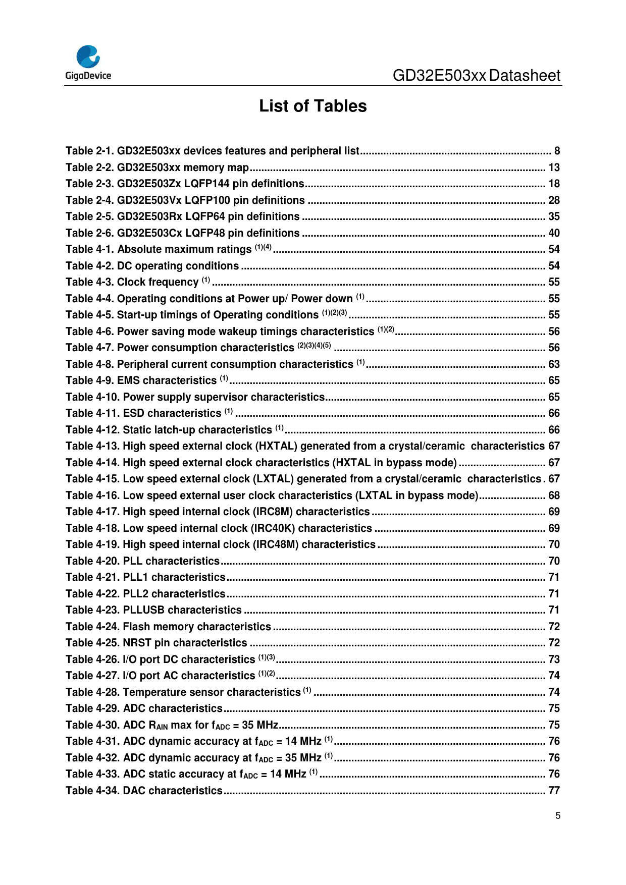 | 页数 / 页 | 98 / 6 — List of Tables. Table 2-1. GD32E503xx devices features and peripheral … |
