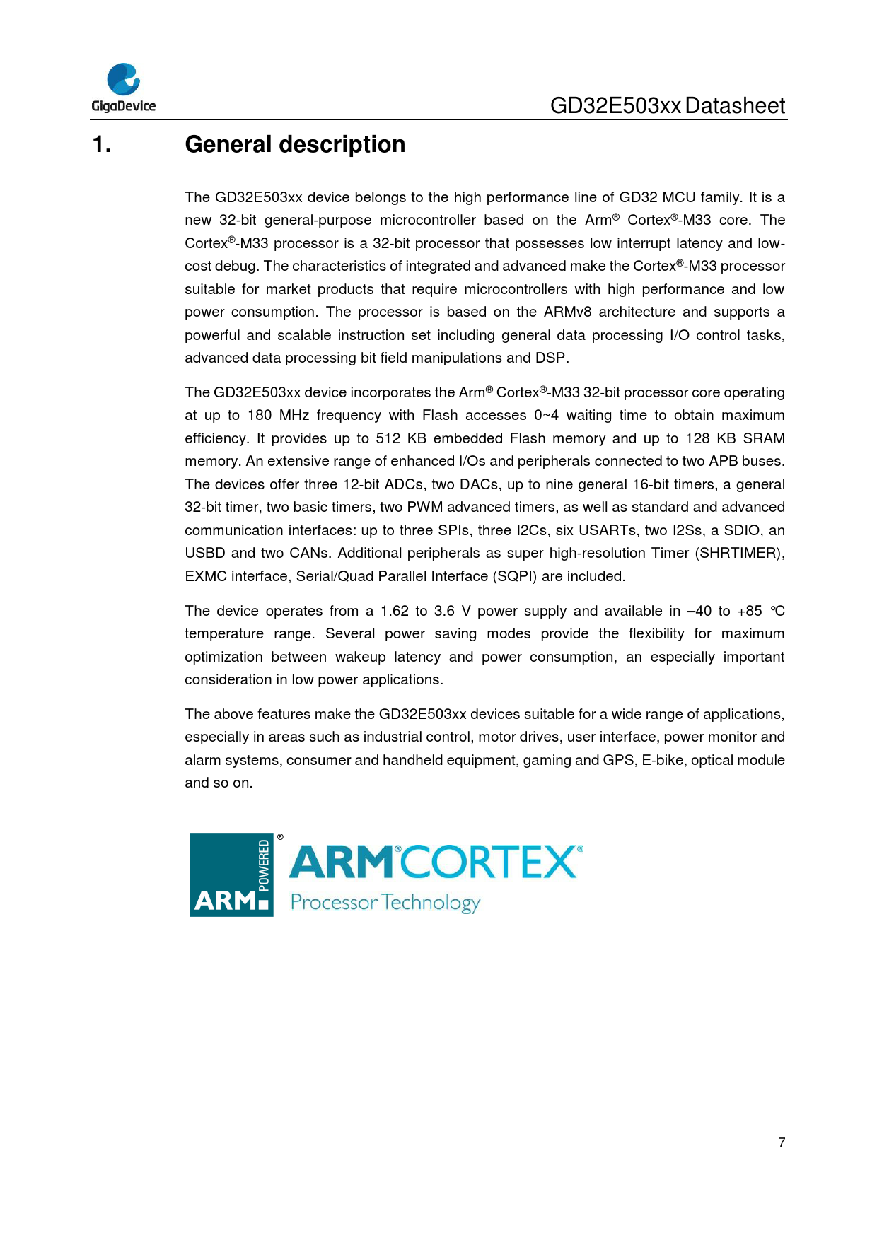 GD32E503xx Datasheet 1.General description The GD32E503xx device belongs to the high performance line of GD32 MCU family. It is a new 32-bit general-purpose microcontroller based on the Arm® Cortex®-M33 core. The Cortex®-M33 processor is a 32-bit processor that possesses low interrupt latency and low- cost debug. The characteristics of integrated and advanced make the Cortex®-M33 processor suitable for market products that require microcontrollers with high performance and low power consumption. The processor is based on the ARMv8 architecture and supports a powerful and scalable instruction set including general data processing I/O control tasks, advanced data processing bit field manipulations and DSP. The GD32E503xx device incorporates the Arm® Cortex®-M33 32-bit processor core operating at up to 180 MHz frequency with Flash accesses 0~4 waiting time to obtain maximum efficiency. It provides up to 512 KB embedded Flash memory and up to 128 KB SRAM memory. An extensive range of enhanced I/Os and peripherals connected to two APB buses. The devices offer three 12-bit ADCs, two DACs, up to nine general 16-bit timers, a general 32-bit timer, two basic timers, two PWM advanced timers, as well as standard and advanced communication interfaces: up to three SPIs, three I2Cs, six USARTs, two I2Ss, a SDIO, an USBD and two CANs. Additional peripherals as super high-resolution Timer (SHRTIMER), EXMC interface, Serial/Quad Parallel Interface (SQPI) are included. The device operates from a 1.62 to 3.6 V power supply and available in –40 to +85 °C temperature range. Several power saving modes provide the flexibility for maximum optimization between wakeup latency and power consumption, an especially important consideration in low power applications. The above features make the GD32E503xx devices suitable for a wide range of applications, especially in areas such as industrial control, motor drives, user interface, power monitor and alarm systems, consumer and handheld equipment, gaming and GPS, E-bike, optical module and so on. 7 Document Outline Table of Contents List of Figures List of Tables 1. General description 2. Device overview 2.1. Device information 2.2. Block diagram 2.3. Pinouts and pin assignment 2.4. Memory map 2.5. Clock tree 2.6. Pin definitions 2.6.1. GD32E503Zx LQFP144 pin definitions 2.6.2. GD32E503Vx LQFP100 pin definitions 2.6.3. GD32E503Rx LQFP64 pin definitions 2.6.4. GD32E503Cx LQFP48 pin definitions 3. Functional description 3.1. Arm® Cortex®-M33 core 3.2. Embedded memory 3.3. Clock, reset and supply management 3.4. Boot modes 3.5. Power saving modes 3.6. Analog to digital converter (ADC) 3.7. Digital to analog converter (DAC) 3.8. DMA 3.9. General-purpose inputs/outputs (GPIOs) 3.10. Timers and PWM generation 3.11. Real time clock (RTC) 3.12. Inter-integrated circuit (I2C) 3.13. Serial peripheral interface (SPI) 3.14. Universal synchronous asynchronous receiver transmitter (USART) 3.15. Inter-IC sound (I2S) 3.16. Universal Serial Bus full-speed device interface (USBD) 3.17. Controller area network (CAN) 3.18. External memory controller (EXMC) 3.19. Secure digital input/output interface (SDIO) 3.20. Super High-Resolution Timer (SHRTIMER) 3.21. Serial/Quad Parallel Interface (SQPI) 3.22. Debug mode 3.23. Package and operation temperature 4. Electrical characteristics 4.1. Absolute maximum ratings 4.2. Operating conditions characteristics 4.3. Power consumption 4.4. EMC characteristics 4.5. Power supply supervisor characteristics 4.6. Electrical sensitivity 4.7. External clock characteristics 4.8. Internal clock characteristics 4.9. PLL characteristics 4.10. Memory characteristics 4.11. NRST pin characteristics 4.12. GPIO characteristics 4.13. Temperature sensor characteristics 4.14. ADC characteristics 4.15. DAC characteristics 4.16. I2C characteristics 4.17. SPI characteristics 4.18. I2S characteristics 4.19. USART characteristics 4.20. CAN characteristics 4.21. USBD characteristics 4.22. SDIO characteristics 4.23. EXMC characteristics 4.24. Serial/Quad Parallel Interface (SQPI) characteristics 4.25. Super High-Resolution Timer (SHRTIMER) characteristics 4.26. TIMER characteristics 4.27. WDGT characteristics 4.28. Parameter condition 5. Package information 5.1. LQFP144 package outline dimensions 5.2. LQFP100 package outline dimensions 5.3. LQFP64 package outline dimensions 5.4. LQFP48 package outline dimensions 6. Ordering information 7. Revision history
