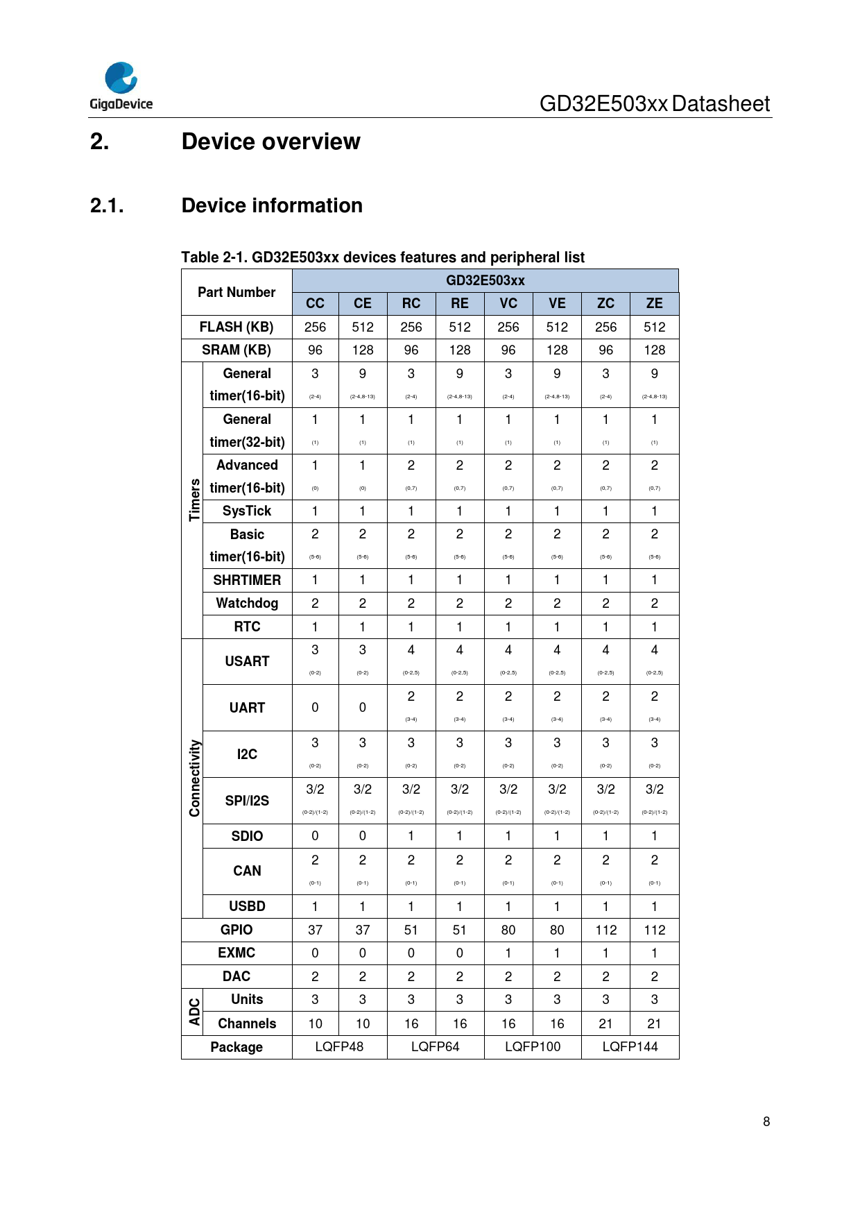 Device overview. 2.1. Device information. Table 2-1. GD32E503xx devices features and peripheral list. GD32E503xx. Part Number