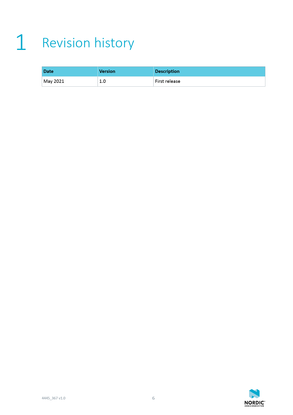 May 2021 1.0 First release 4445_367 v1.0 6 Document Outline Contents nPM1100 Feature list Revision history About this document 2.1 Document status 2.2 Core component chapters Product overview 3.1 Block diagram 3.1.1 In circuit configurations 3.2 System description 3.3 Power-on reset (POR) and brownout reset (BOR) 3.4 DPPM — Dynamic power-path management 3.5 Using Ship mode 3.6 Thermal protection 3.7 Battery considerations 3.8 Charging and Error LED drivers 3.9 System electrical parameters 3.10 System efficiency Absolute maximum ratings Recommended operating conditions 5.1 Dissipation ratings 5.2 WLCSP light sensitivity Core components 6.1 SYSREG — System regulator 6.1.1 USB port detection and VBUS current limiting 6.1.2 SYSREG resistance and output voltage 6.1.3 VBUS overvoltage and undervoltage protection 6.1.4 VBUS disconnect 6.1.5 Electrical parameters 6.1.6 Electrical characteristics 6.2 CHARGER — Battery charger 6.2.1 Charging cycle 6.2.2 Battery detection and UVLO 6.2.3 Termination voltage (VTERMSET) 6.2.4 Termination and trickle charge current 6.2.5 Charge current limit (ICHG) 6.2.6 Battery thermal protection using NTC thermistor (NTC) 6.2.7 Charger thermal regulation 6.2.8 Charger error conditions 6.2.9 Charging indication (CHG) and charging error indication (ERR) 6.2.10 DPPM — Dynamic power-path management 6.2.11 Electrical parameters 6.2.12 Electrical characteristics 6.3 BUCK — Buck regulator 6.3.1 Output voltage selection (VOUTBSET0, VOUTBSET1) 6.3.2 BUCK mode selection (MODE) 6.3.3 Component selection 6.3.4 Electrical parameters 6.3.5 Electrical characteristics Application 7.1 Schematic 7.2 Supplying from BUCK 7.3 USB port negotiation 7.4 CHG and ERR 7.5 Termination voltage and current 7.6 NTC configuration 7.7 Ship mode 7.8 Battery monitoring and low battery indication Hardware and layout 8.1 Ball assignments 8.2 Mechanical specifications 8.2.1 WLCSP 2.075x2.075 mm package 8.3 Reference circuitry 8.3.1 Configuration 1 8.3.2 Configuration 2 8.3.3 Configuration 3 8.3.4 PCB guidelines 8.3.5 PCB layout example Ordering information 9.1 IC marking 9.2 Box labels 9.3 Order code 9.4 Code ranges and values 9.5 Product options Legal notices