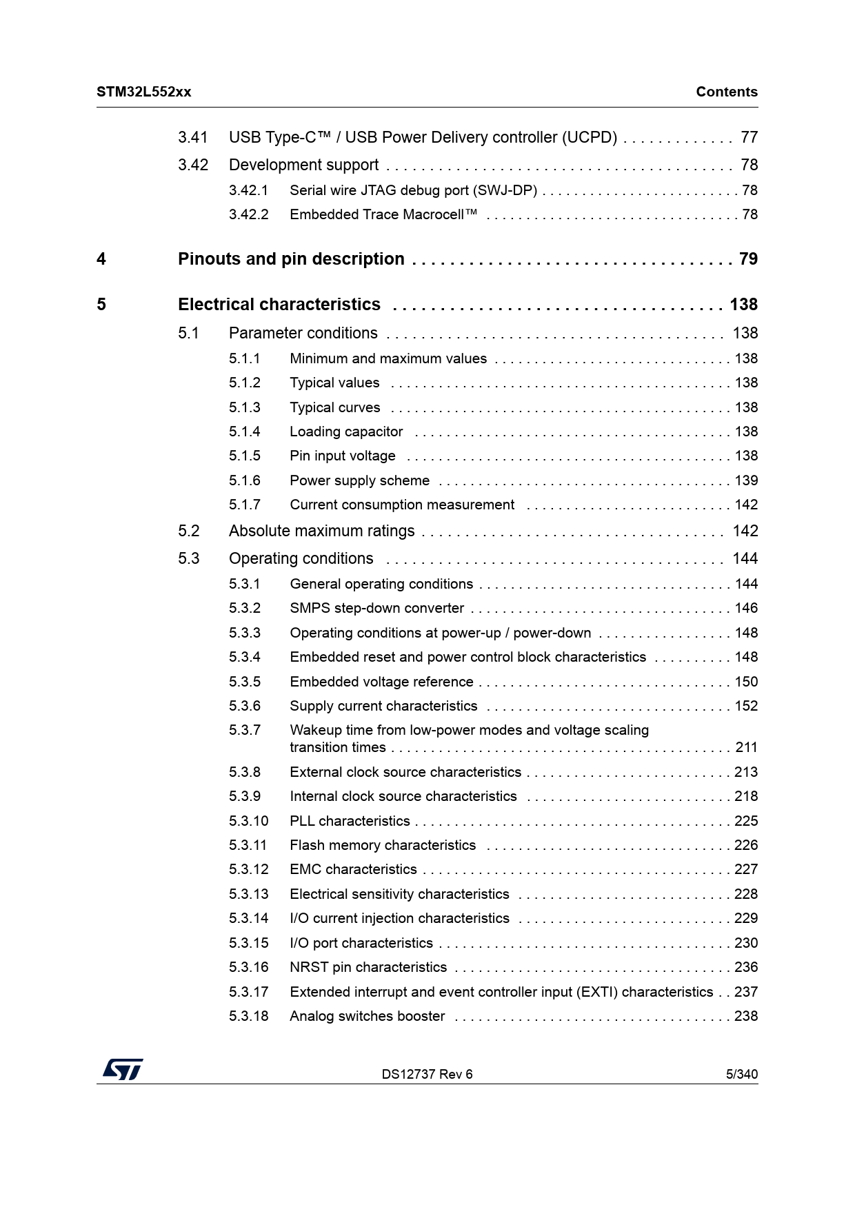 link to page 77 link to page 78 link to page 78 link to page 78 link to page 79 link to page 138 link to page 138 link to page 138 link to page 138 link to page 138 link to page 138 link to page 138 link to page 139 link to page 142 link to page 142 link to page 144 link to page 144 link to page 146 link to page 148 link to page 148 link to page 150 link to page 152 link to page 211 link to page 213 link to page 218 link to page 225 link to page 226 link to page 227 link to page 228 link to page 229 link to page 230 link to page 236 link to page 237 link to page 238 STM32L552xxContents 3.41 USB Type-C™ / USB Power Delivery controller (UCPD) . 77 3.42 Development support . 78 3.42.1 Serial wire JTAG debug port (SWJ-DP) . 78 3.42.2 Embedded Trace Macrocell™ . 78 4Pinouts and pin description . 795Electrical characteristics . 138 5.1 Parameter conditions . 138 5.1.1 Minimum and maximum values . 138 5.1.2 Typical values . 138 5.1.3 Typical curves . 138 5.1.4 Loading capacitor . 138 5.1.5 Pin input voltage . 138 5.1.6 Power supply scheme . 139 5.1.7 Current consumption measurement . 142 5.2 Absolute maximum ratings . 142 5.3 Operating conditions . 144 5.3.1 General operating conditions . 144 5.3.2 SMPS step-down converter . 146 5.3.3 Operating conditions at power-up / power-down . 148 5.3.4 Embedded reset and power control block characteristics . 148 5.3.5 Embedded voltage reference . 150 5.3.6 Supply current characteristics . 152 5.3.7 Wakeup time from low-power modes and voltage scaling transition times . 211 5.3.8 External clock source characteristics . 213 5.3.9 Internal clock source characteristics . 218 5.3.10 PLL characteristics . 225 5.3.11 Flash memory characteristics . 226 5.3.12 EMC characteristics . 227 5.3.13 Electrical sensitivity characteristics . 228 5.3.14 I/O current injection characteristics . 229 5.3.15 I/O port characteristics . 230 5.3.16 NRST pin characteristics . 236 5.3.17 Extended interrupt and event controller input (EXTI) characteristics . 237 5.3.18 Analog switches booster . 238 DS12737 Rev 6 5/340 6 Document Outline Table 1. Device summary 1 Introduction 2 Description Table 2. STM32L552xx features and peripheral counts (continued) Figure 1. STM32L552xx block diagram 3 Functional overview 3.1 Arm® Cortex®-M33 core with TrustZone® and FPU 3.2 Art Accelerator – instruction cache (ICACHE) 3.3 Memory protection unit 3.4 Embedded Flash memory 3.5 Embedded SRAM 3.6 Boot modes Table 3. Boot modes when TrustZone is disabled (TZEN=0) Table 4. Boot modes when TrustZone is enabled (TZEN=1) Table 5. Boot space versus RDP protection (continued) 3.7 Global TrustZone controller (GTZC) 3.8 TrustZone security architecture Table 6. Example of memory map security attribution vs SAU configuration regions 3.8.1 TrustZone peripheral classification Table 7. Securable peripherals by TZSC (continued) Table 8. TrustZone-aware peripherals 3.9 Power supply management 3.9.1 Power supply schemes Figure 2. STM32L552xx power supply overview Figure 3. STM32L552xxxxP power supply overview Figure 4. STM32L552xxxxQ power supply overview Figure 5. Power-up/down sequence 3.9.2 Power supply supervisor 3.9.3 Voltage regulator 3.9.4 SMPS step down converter Figure 6. SMPS step down converter power supply scheme Table 9. SMPS external components 3.9.5 Low-power modes Table 10. STM32L552xx modes overview (continued) Table 11. Functionalities depending on the working mode (continued) 3.9.6 Reset mode 3.9.7 VBAT operation 3.9.8 PWR TrustZone security 3.10 Peripheral interconnect matrix Table 12. STM32L552xx peripherals interconnect matrix (continued) 3.11 Reset and clock controller (RCC) Figure 7. STM32L552xx clock tree 3.12 Clock recovery system (CRS) 3.13 General-purpose inputs/outputs (GPIOs) 3.14 Multi-AHB bus matrix Figure 8. Multi-AHB bus matrix 3.15 Direct memory access controller (DMA) Table 13. DMA1 and DMA2 implementation 3.16 DMA request router (DMAMUX) 3.17 Interrupts and events 3.17.1 Nested vectored interrupt controller (NVIC) 3.17.2 Extended interrupt/event controller (EXTI) 3.18 Cyclic redundancy check calculation unit (CRC) 3.19 Flexible static memory controller (FSMC) 3.20 Octo-SPI interface (OCTOSPI) 3.21 Analog-to-digital converter (ADC) 3.21.1 Temperature sensor Table 14. Temperature sensor calibration values 3.21.2 Internal voltage reference (VREFINT) Table 15. Internal voltage reference calibration values 3.21.3 VBAT battery voltage monitoring 3.22 Digital to analog converter (DAC) 3.23 Voltage reference buffer (VREFBUF) Figure 9. Voltage reference buffer 3.24 Comparators (COMP) 3.25 Operational amplifier (OPAMP) 3.26 Digital filter for sigma-delta modulators (DFSDM) 3.27 Touch sensing controller (TSC) 3.28 True random number generator (RNG) 3.29 HASH hardware accelerator (HASH) 3.30 Timers and watchdogs Table 16. Timer feature comparison 3.30.1 Advanced-control timer (TIM1, TIM8) 3.30.2 General-purpose timers (TIM2, TIM3, TIM4, TIM5, TIM15, TIM16, TIM17) 3.30.3 Basic timers (TIM6 and TIM7) 3.30.4 Low-power timers (LPTIM1, LPTIM2 and LPTIM3) 3.30.5 Independent watchdog (IWDG) 3.30.6 Window watchdog (WWDG) 3.30.7 SysTick timer 3.31 Real-time clock (RTC) 3.32 Tamper and backup registers (TAMP) 3.33 Inter-integrated circuit interface (I2C) Table 17. I2C implementation 3.34 Universal synchronous/asynchronous receiver transmitter (USART) Table 18. USART/UART/LPUART features 3.35 Low-power universal asynchronous receiver transmitter (LPUART) 3.36 Serial peripheral interface (SPI) 3.37 Serial audio interfaces (SAI) Table 19. SAI implementation 3.38 Secure digital input/output and MultiMediaCards Interface (SDMMC) 3.39 Controller area network (FDCAN) 3.40 Universal serial bus (USB FS) 3.41 USB Type-C™ / USB Power Delivery controller (UCPD) 3.42 Development support 3.42.1 Serial wire JTAG debug port (SWJ-DP) 3.42.2 Embedded Trace Macrocell™ 4 Pinouts and pin description Figure 10. STM32L552xx LQFP48 pinout Figure 11. STM32L552xxxxP LQFP48 external SMPS pinout Figure 12. STM32L552xx 
