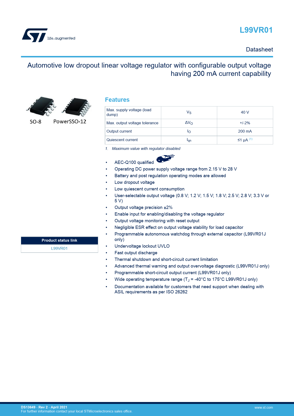 页数 / 页47 / 1 — L99VR01. Features. Product status link. DS13649. Rev 2. April 2021