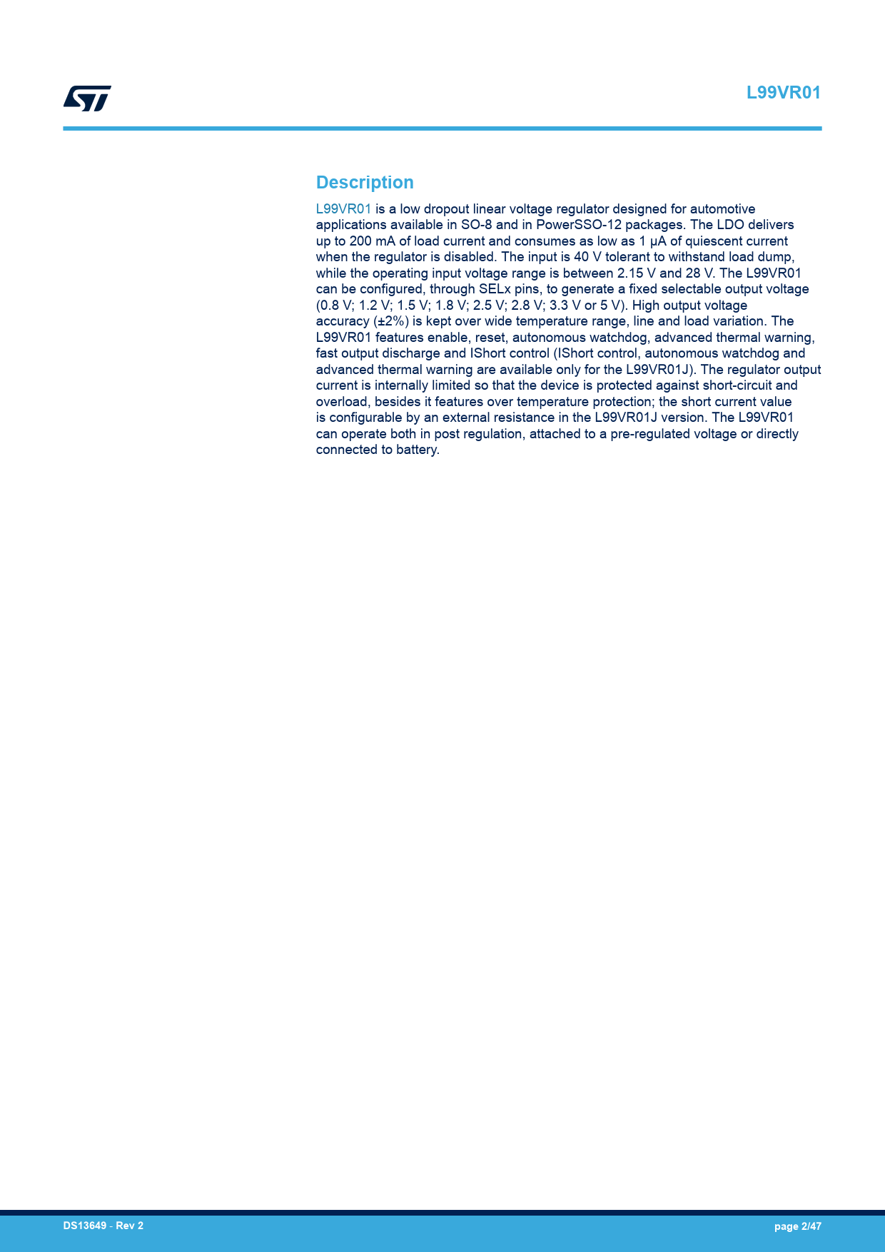 页数 / 页47 / 2 — L99VR01. Description. DS13649. Rev 2. page 2/47