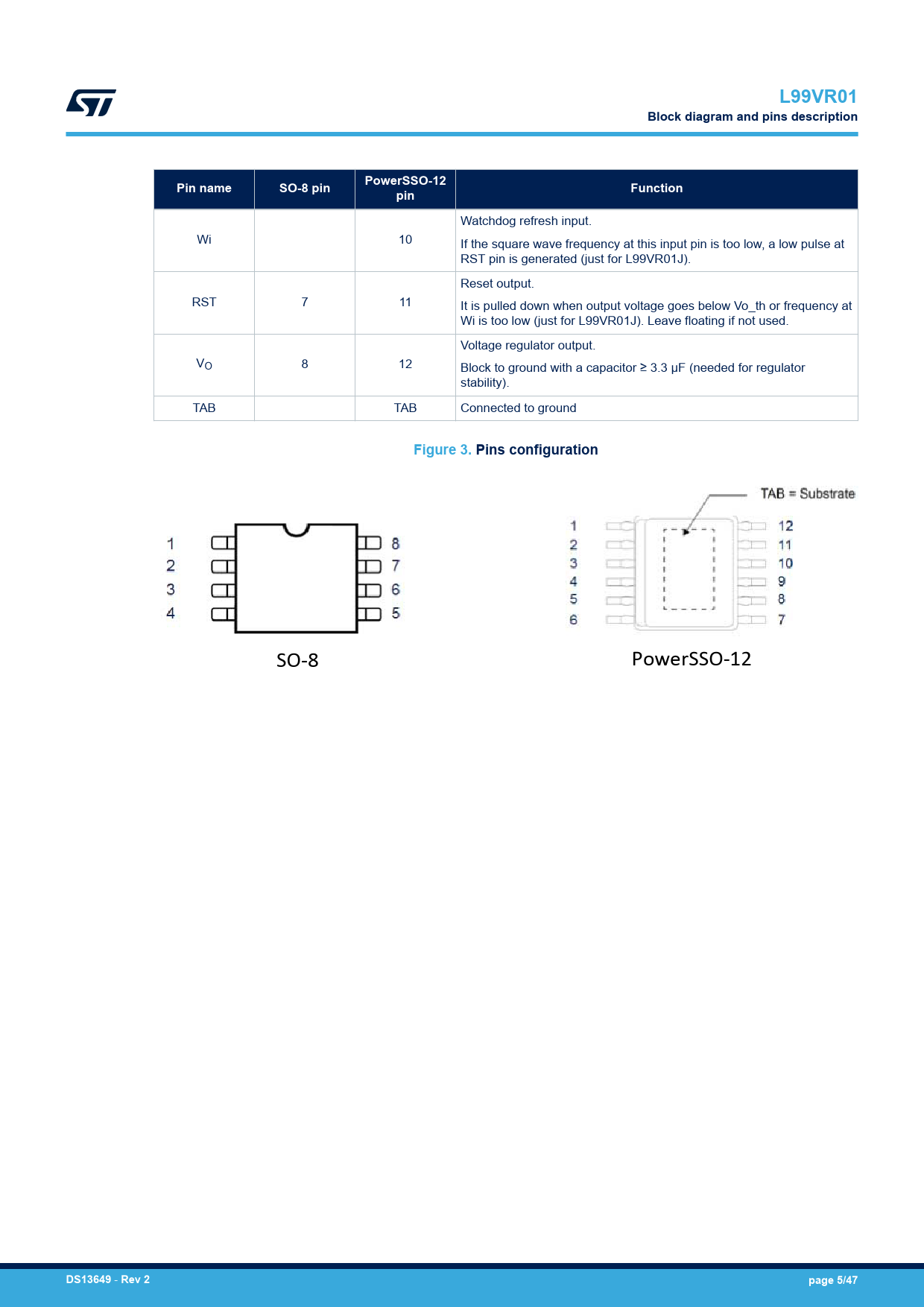 L99VR01Block diagram and pins descriptionPowerSSO-12Pin nameSO-8 pinFunctionpin Watchdog refresh input. Wi 10 If the square wave frequency at this input pin is too low, a low pulse at RST pin is generated (just for L99VR01J). Reset output. RST 7 11 It is pulled down when output voltage goes below Vo_th or frequency at Wi is too low (just for L99VR01J). Leave floating if not used. Voltage regulator output. VO 8 12 Block to ground with a capacitor ≥ 3.3 µF (needed for regulator stability). TAB TAB Connected to ground Figure 3. Pins configuration SO-8 PowerSSO-12 DS13649 - Rev 2page 5/47 Document Outline Cover image Product status link / summary Features Description 1 Block diagram and pins description 2 Electrical specifications 2.1 Absolute maximum ratings 2.2 Thermal data 2.2.1 Thermal resistance 2.2.2 Thermal protection 2.3 Electrical characteristics 2.4 Electrical characteristics curves 3 Test circuit and waveforms plot 3.1 Load regulation 4 Application information 4.1 Voltage regulator 4.2 Output current limitation 4.3 Output voltage selection 4.4 Enable 4.5 Reset 4.6 Autonomous watchdog 4.7 Thermal warning and thermal shutdown 4.8 Overvoltage detection by advanced thermal warning read-out 4.9 Fast output discharge 4.10 Undervoltage lockout UVLO 4.11 Functional safety management 5 Application 6 Package and PCB thermal data 6.1 PowerSSO-12 Thermal data 6.2 SO-8 thermal data 7 Package information 7.1 PowerSSO-12 package information 7.2 SO-8 package information 7.3 PowerSSO-12 packaging information 7.4 SO-8 packaging information 8 Order codes Revision history Contents List of tables List of figures