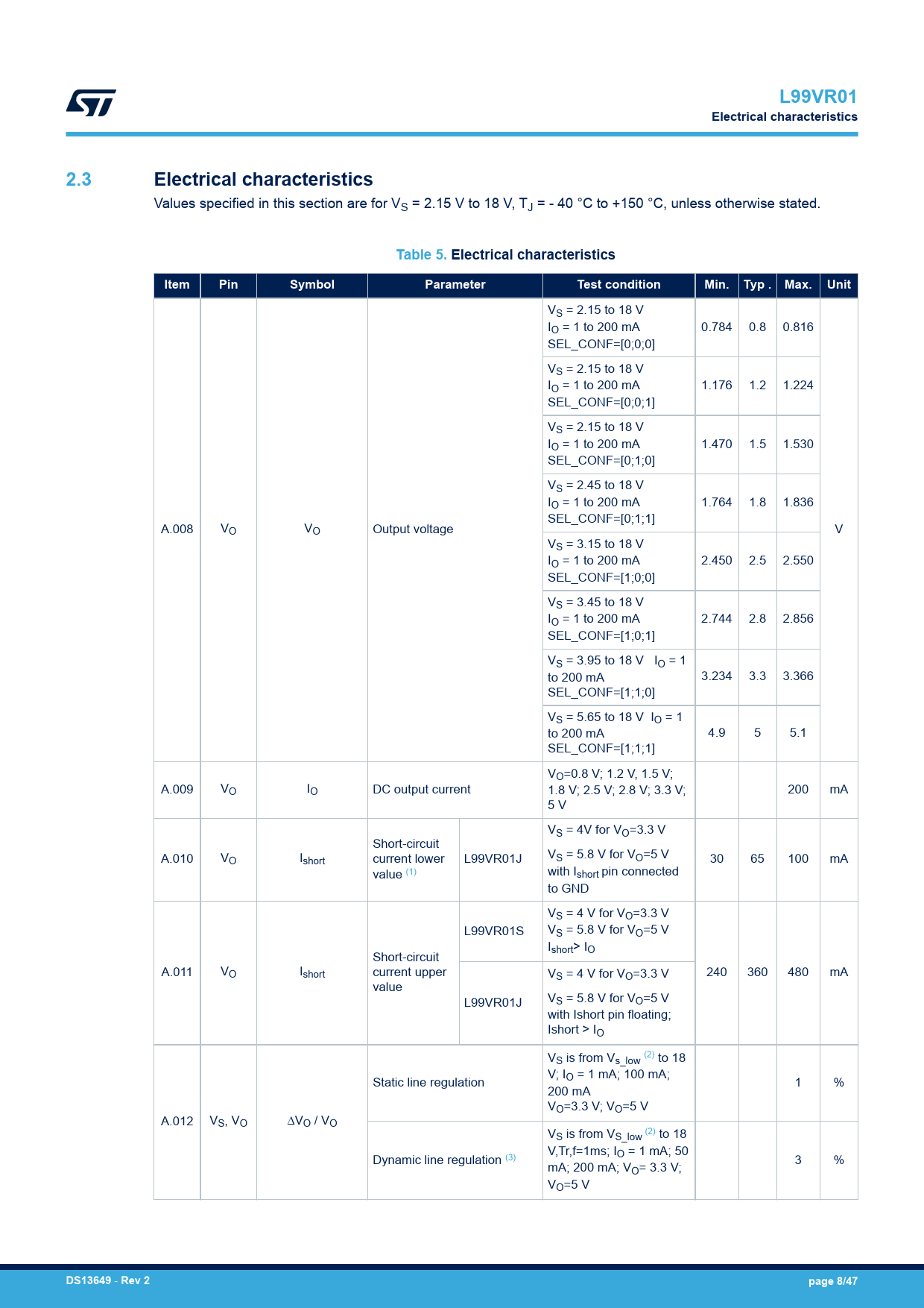 页数 / 页47 / 8 — L99VR01. Electrical characteristics. 2.3. Table 5. Electrical …