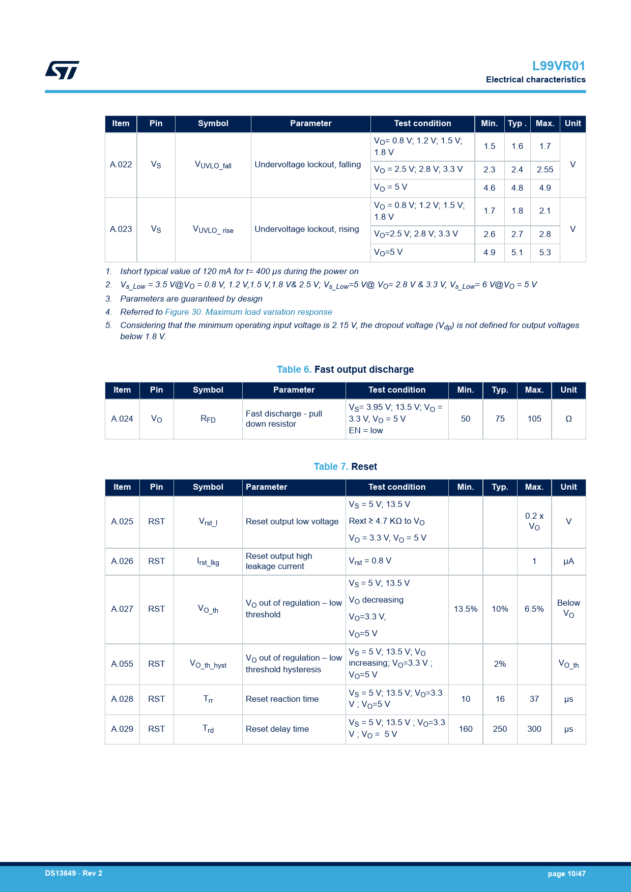 link to page 17 L99VR01Electrical characteristicsItemPinSymbolParameterTest conditionMin.Typ . Max.Unit VO= 0.8 V; 1.2 V; 1.5 V; 1.5 1.6 1.7 1.8 V A.022 VS VUVLO_fall Undervoltage lockout, falling V VO = 2.5 V; 2.8 V; 3.3 V 2.3 2.4 2.55 VO = 5 V 4.6 4.8 4.9 VO = 0.8 V; 1.2 V; 1.5 V; 1.7 1.8 2.1 1.8 V A.023 VS VUVLO_ rise Undervoltage lockout, rising V VO=2.5 V; 2.8 V; 3.3 V 2.6 2.7 2.8 VO=5 V 4.9 5.1 5.3 1. Ishort typical value of 120 mA for t= 400 µs during the power on 2. Vs_Low = 3.5 V@VO = 0.8 V, 1.2 V,1.5 V,1.8 V& 2.5 V; Vs_Low=5 V@ VO= 2.8 V & 3.3 V, Vs_Low= 6 V@VO = 5 V 3. Parameters are guaranteed by design 4. Referred to Figure 30. Maximum load variation response 5. Considering that the minimum operating input voltage is 2.15 V, the dropout voltage (Vdp) is not defined for output voltages below 1.8 V. Table 6. Fast output dischargeItemPinSymbolParameterTest conditionMin.Typ.Max.Unit V Fast discharge - pull S= 3.95 V; 13.5 V; VO = A.024 VO RFD 3.3 V, V 50 75 105 Ω down resistor O = 5 V EN = low Table 7. ResetItemPinSymbolParameterTest conditionMin.Typ.Max.Unit VS = 5 V; 13.5 V 0.2 x A.025 RST Vrst_l Reset output low voltage Rext ≥ 4.7 KΩ to VO V V O VO = 3.3 V, VO = 5 V Reset output high A.026 RST Irst_lkg V leakage current rst = 0.8 V 1 µA VS = 5 V; 13.5 V V VO decreasing Below A.027 RST V O out of regulation – low O_th 13.5% 10% 6.5% threshold V V O=3.3 V, O VO=5 V V V S = 5 V; 13.5 V; VO A.055 RST V O out of regulation – low O_th_hyst increasing; V 2% V threshold hysteresis O=3.3 V ; O_th VO=5 V V A.028 RST T S = 5 V; 13.5 V; VO=3.3 rr Reset reaction time 10 16 37 µs V ; VO=5 V V A.029 RST T S = 5 V; 13.5 V ; VO=3.3 rd Reset delay time 160 250 300 µs V ; VO = 5 V DS13649 - Rev 2page 10/47 Document Outline Cover image Product status link / summary Features Description 1 Block diagram and pins description 2 Electrical specifications 2.1 Absolute maximum ratings 2.2 Thermal data 2.2.1 Thermal resistance 2.2.2 Thermal protection 2.3 Electrical characteristics 2.4 Electrical characteristics curves 3 Test circuit and waveforms plot 3.1 Load regulation 4 Application information 4.1 Voltage regulator 4.2 Output current limitation 4.3 Output voltage selection 4.4 Enable 4.5 Reset 4.6 Autonomous watchdog 4.7 Thermal warning and thermal shutdown 4.8 Overvoltage detection by advanced thermal warning read-out 4.9 Fast output discharge 4.10 Undervoltage lockout UVLO 4.11 Functional safety management 5 Application 6 Package and PCB thermal data 6.1 PowerSSO-12 Thermal data 6.2 SO-8 thermal data 7 Package information 7.1 PowerSSO-12 package information 7.2 SO-8 package information 7.3 PowerSSO-12 packaging information 7.4 SO-8 packaging information 8 Order codes Revision history Contents List of tables List of figures