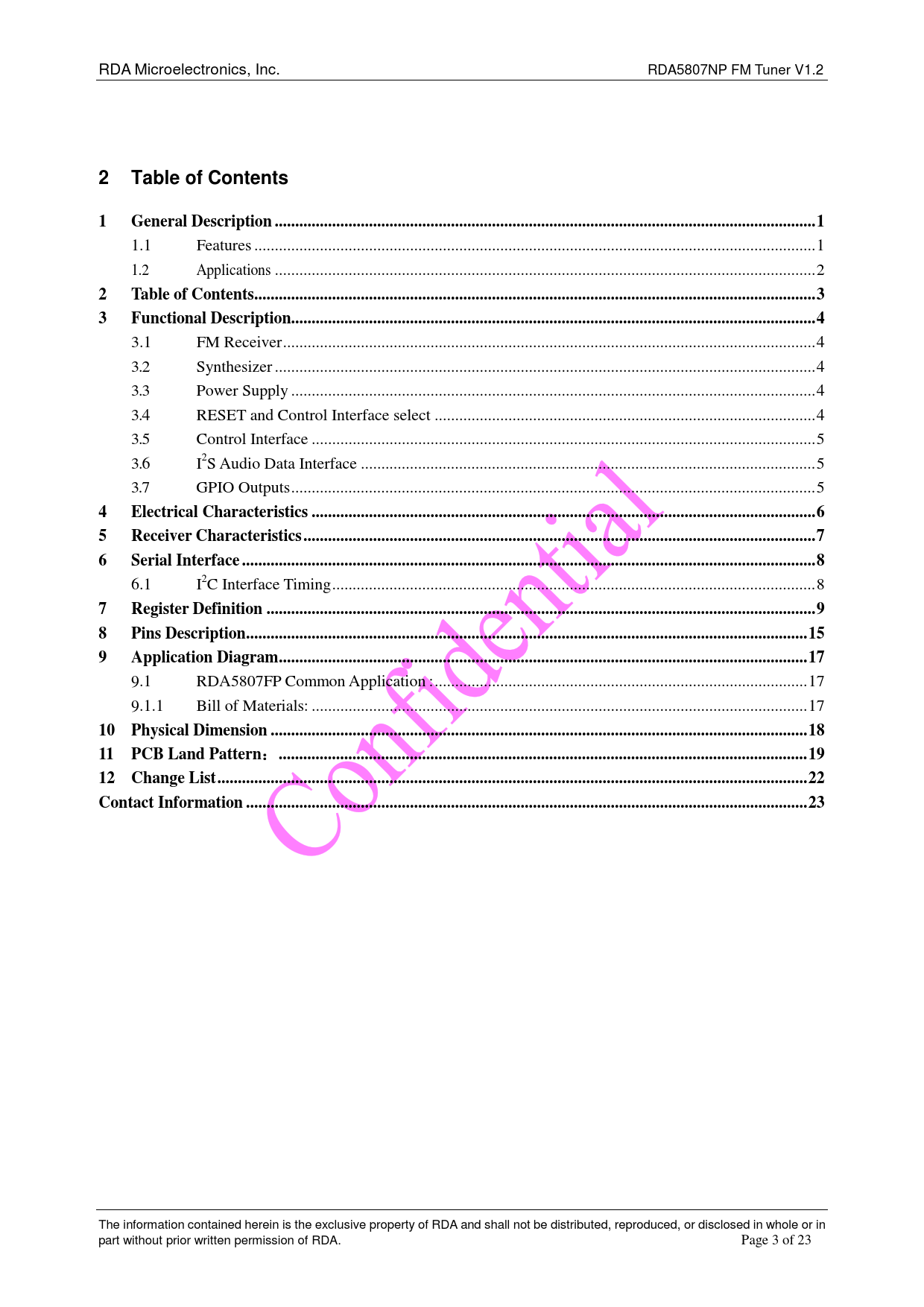 The information contained herein is the exclusive property of RDA and shall not be distributed, reproduced, or disclosed in whole or in part without prior written permission of RDA. Page 3 of 23 Document Outline 1 General Description Features Applications 2 Table of Contents 3 Functional Description 3.1 FM Receiver Synthesizer Power Supply RESET and Control Interface select Control Interface IP2PS Audio Data Interface GPIO Outputs 4 Electrical Characteristics 5 Receiver Characteristics 6 Serial Interface 6.1 IP2PC Interface Timing 7 Register Definition 8 Pins Description 9 Application Diagram 9.1 RDA5807FP Common Application : Bill of Materials: 10 Physical Dimension 11 PCB Land Pattern: 12 Change List Contact Information