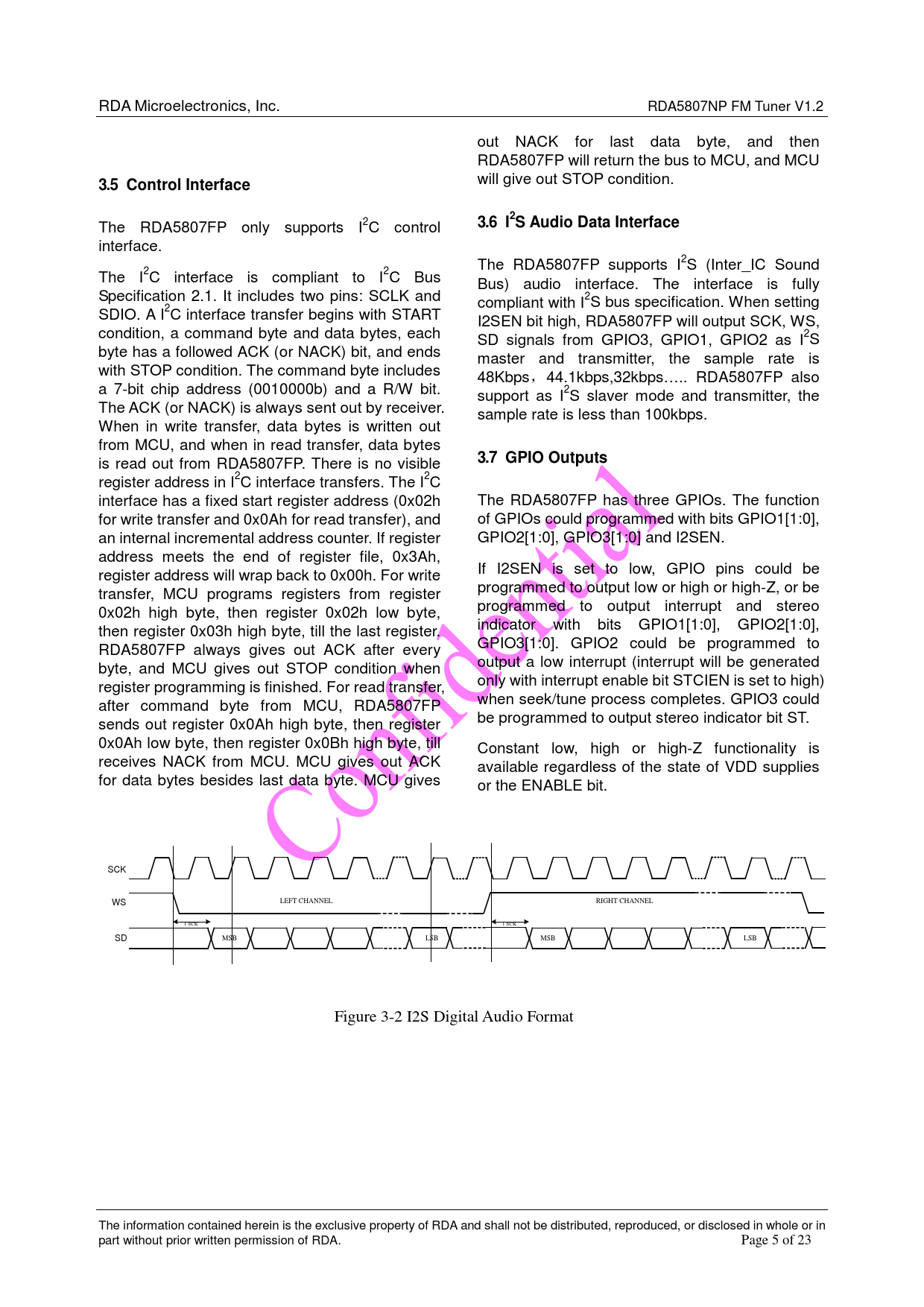 interface. The RDA5807FP supports I2S (Inter_IC Sound The I2C interface is compliant to I2C Bus Bus) audio interface. The interface is fully Specification 2.1. It includes two pins: SCLK and compliant with I2S bus specification. When setting SDIO. A I2C interface transfer begins with START I2SEN bit high, RDA5807FP will output SCK, WS, condition, a command byte and data bytes, each SD signals from GPIO3, GPIO1, GPIO2 as I2S byte has a followed ACK (or NACK) bit, and ends master and transmitter, the sample rate is with STOP condition. The command byte includes 48Kbps,44.1kbps,32kbps….. RDA5807FP also a 7-bit chip address (0010000b) and a R/W bit. support as I2S slaver mode and transmitter, the The ACK (or NACK) is always sent out by receiver. sample rate is less than 100kbps. When in write transfer, data bytes is written out from MCU, and when in read transfer, data bytes is read out from RDA5807FP. There is no visible
