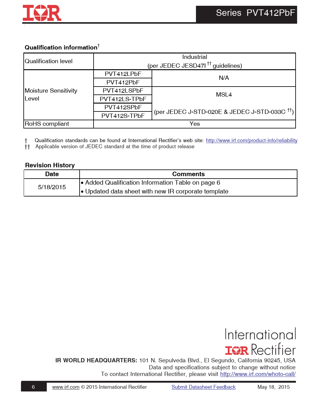 Qualification information. Revision History. Date. Comments. IR WORLD HEADQUARTERS: