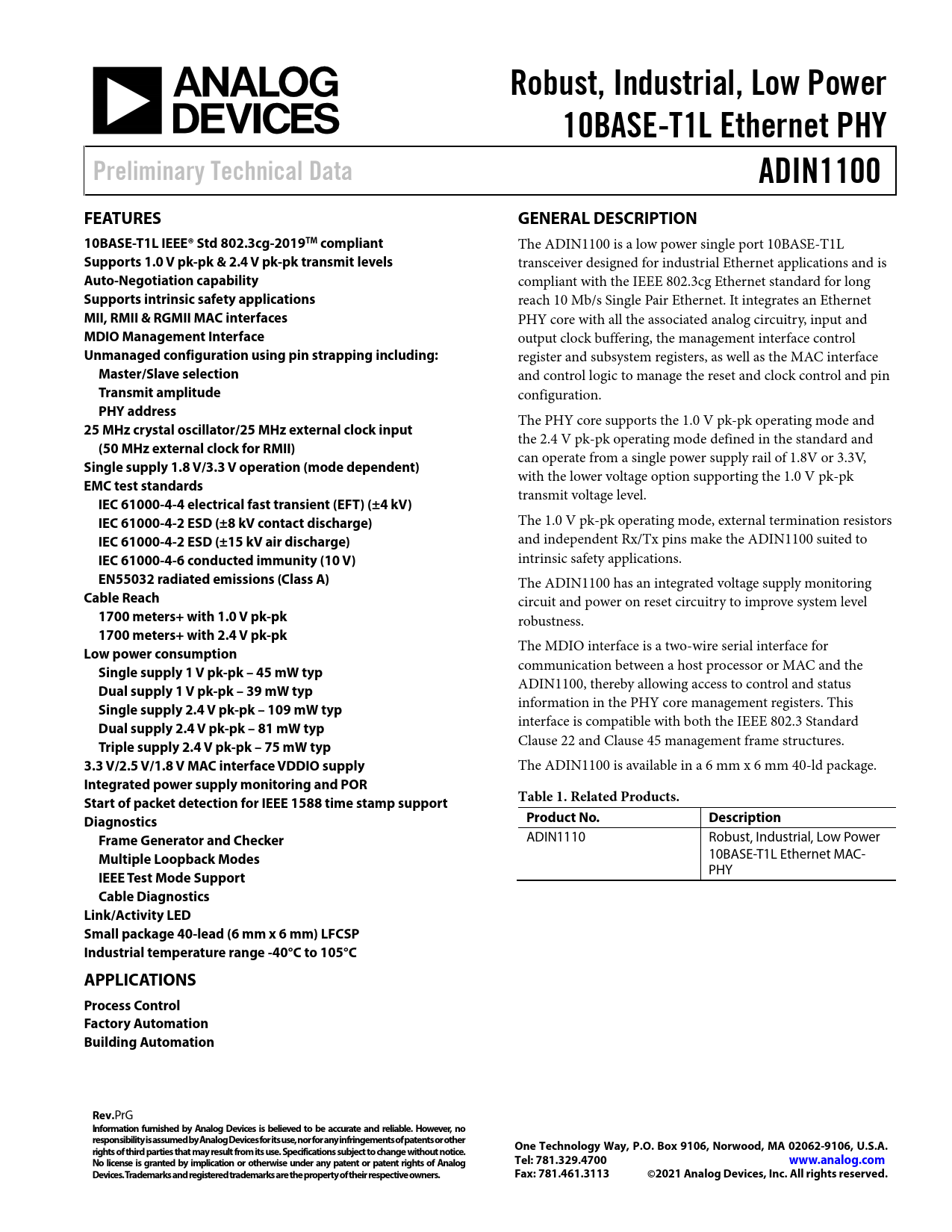 Datasheet ADIN1100 (Analog Devices)