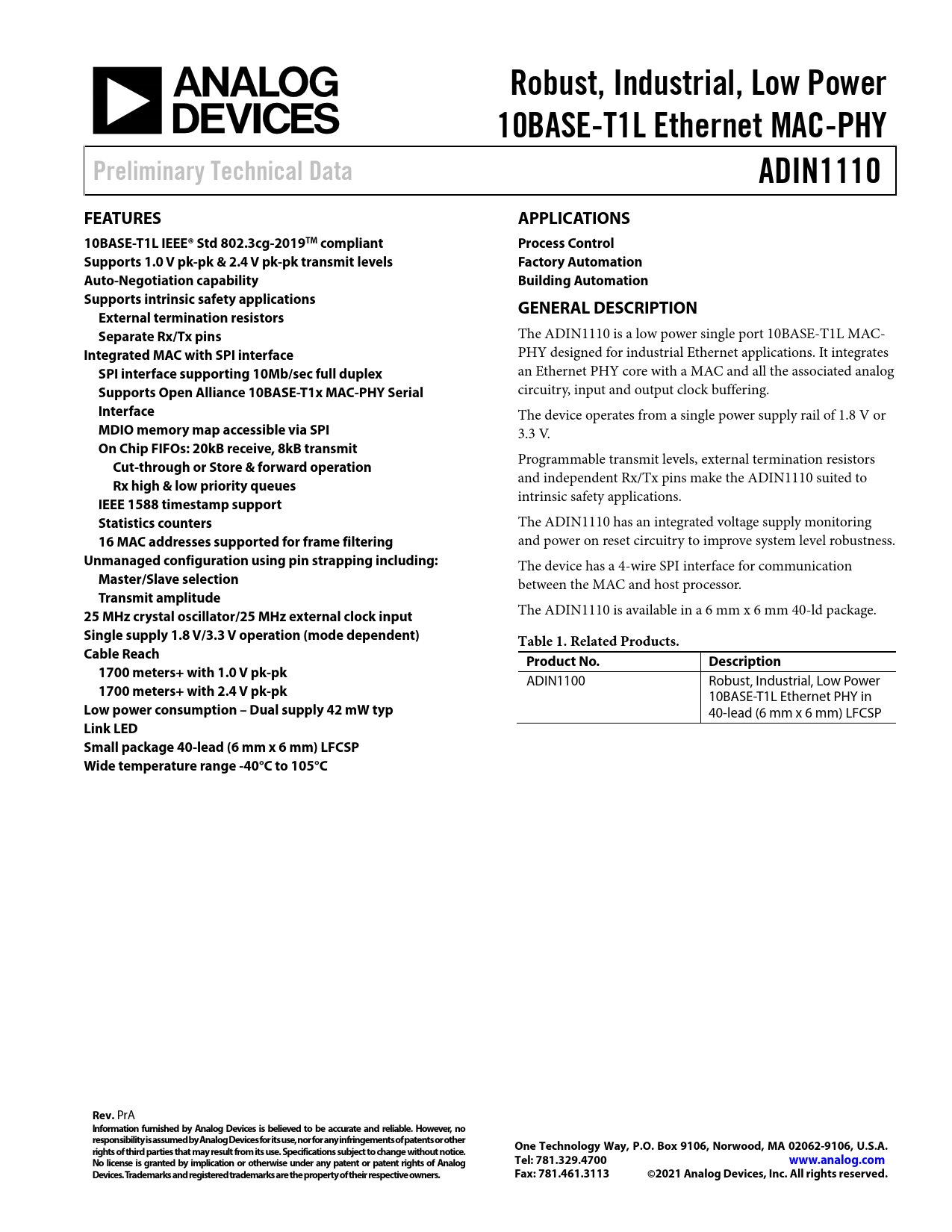 Robust, Industrial, Low Power. 10BASE-T1L Ethernet MAC-PHY. Preliminary Technical Data. ADIN1110. FEATURES. APPLICATIONS