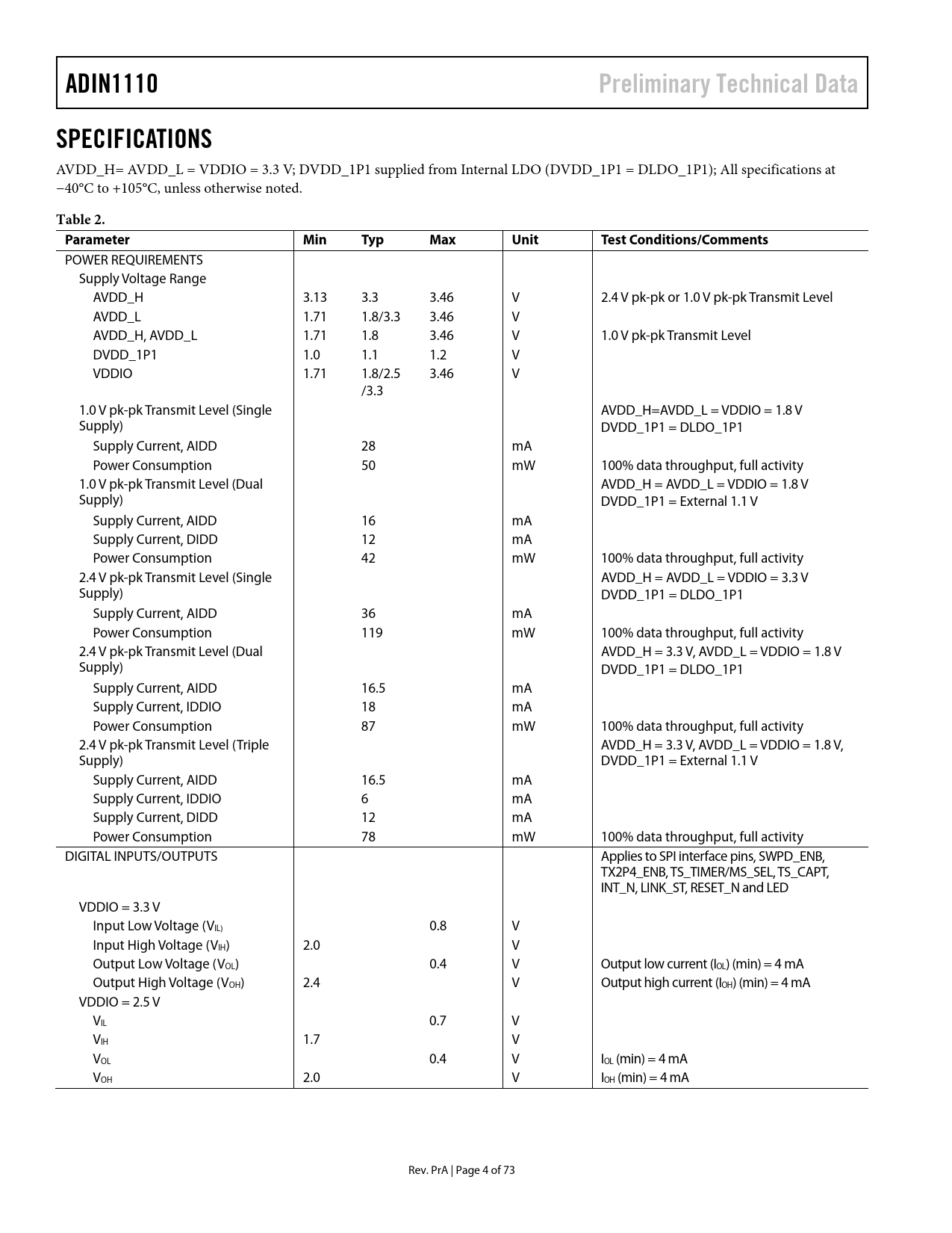 | 页数 / 页 | 73 / 4 — ADIN1110. Preliminary Technical Data. SPECIFICATIONS. Table 2. Parameter. … |