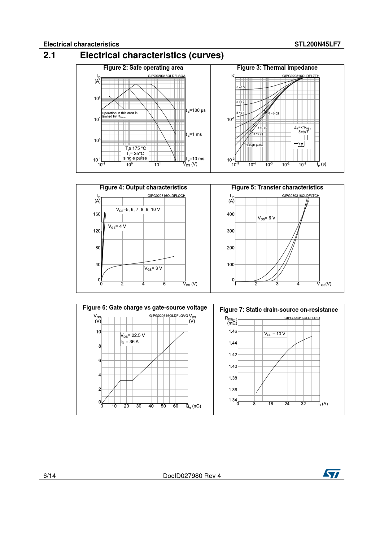 Electrical characteristics STL200N45LF7 2.1 Electrical characteristics (curves) Figure 2: Safe operating area Figure 3: Thermal impedance Figure 4: Output characteristics Figure 5: Transfer characteristics Figure 6: Gate charge vs gate-source voltage Figure 7: Static drain-source on-resistance