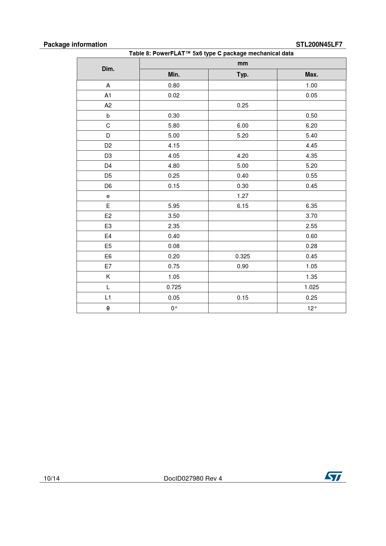 A 0.80 1.00 A1 0.02 0.05 A2 0.25 b 0.30 0.50 C 5.80 6.00 6.20 D 5.00 5.20 5.40 D2 4.15 4.45 D3 4.05 4.20 4.35 D4 4.80 5.00 5.20 D5 0.25 0.40 0.55 D6 0.15 0.30 0.45 e 1.27 E 5.95 6.15 6.35 E2 3.50 3.70 E3 2.35 2.55 E4 0.40 0.60 E5 0.08 0.28 E6 0.20 0.325 0.45 E7 0.75 0.90 1.05 K 1.05 1.35 L 0.725 1.025 L1 0.05 0.15 0.25 θ 0° 12° 10/14 DocID027980 Rev 4