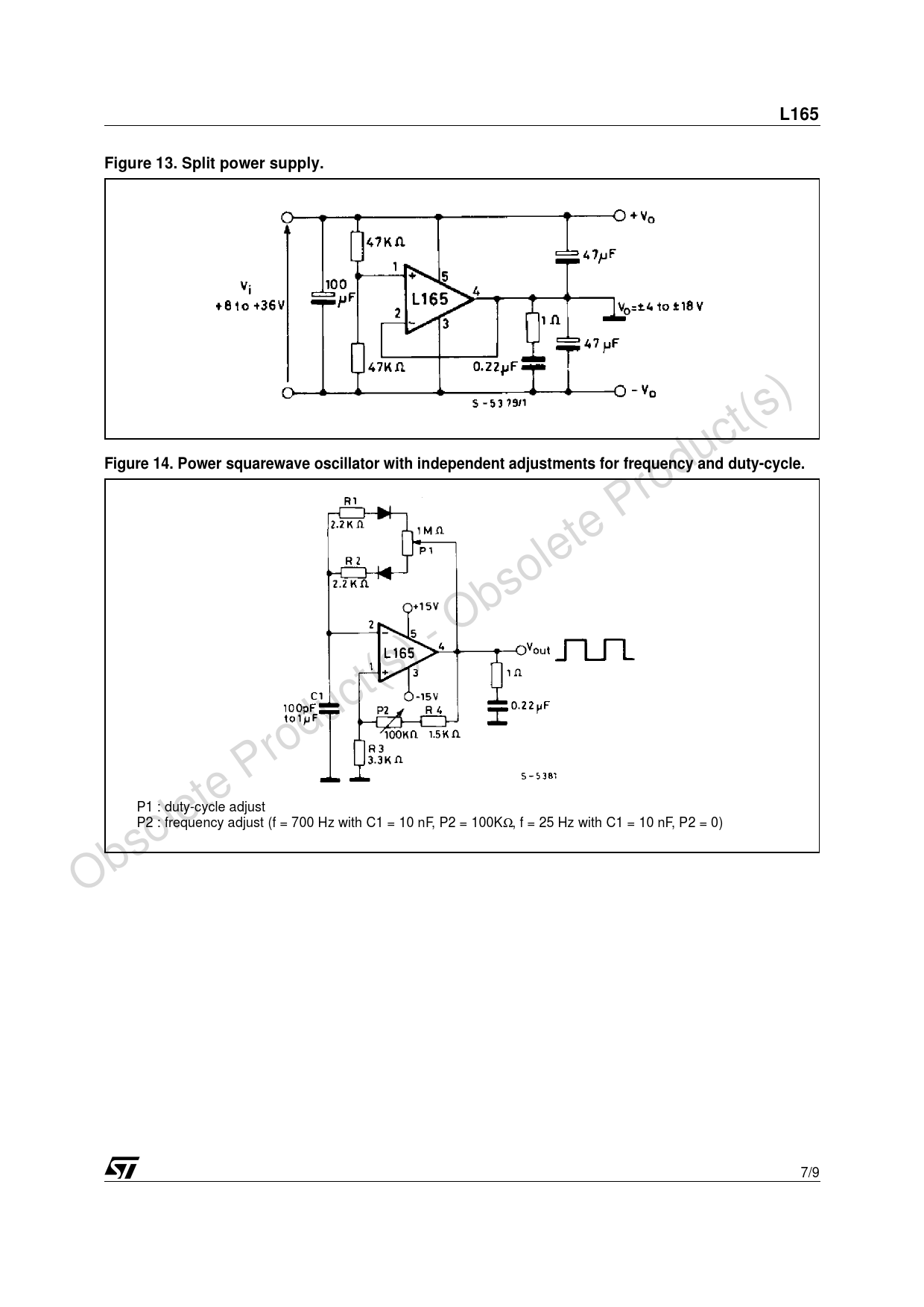 L165 Figure 13. Split power supply. Figure 14. Power squarewave oscillator with independent adjustments for frequency and duty-cycle.