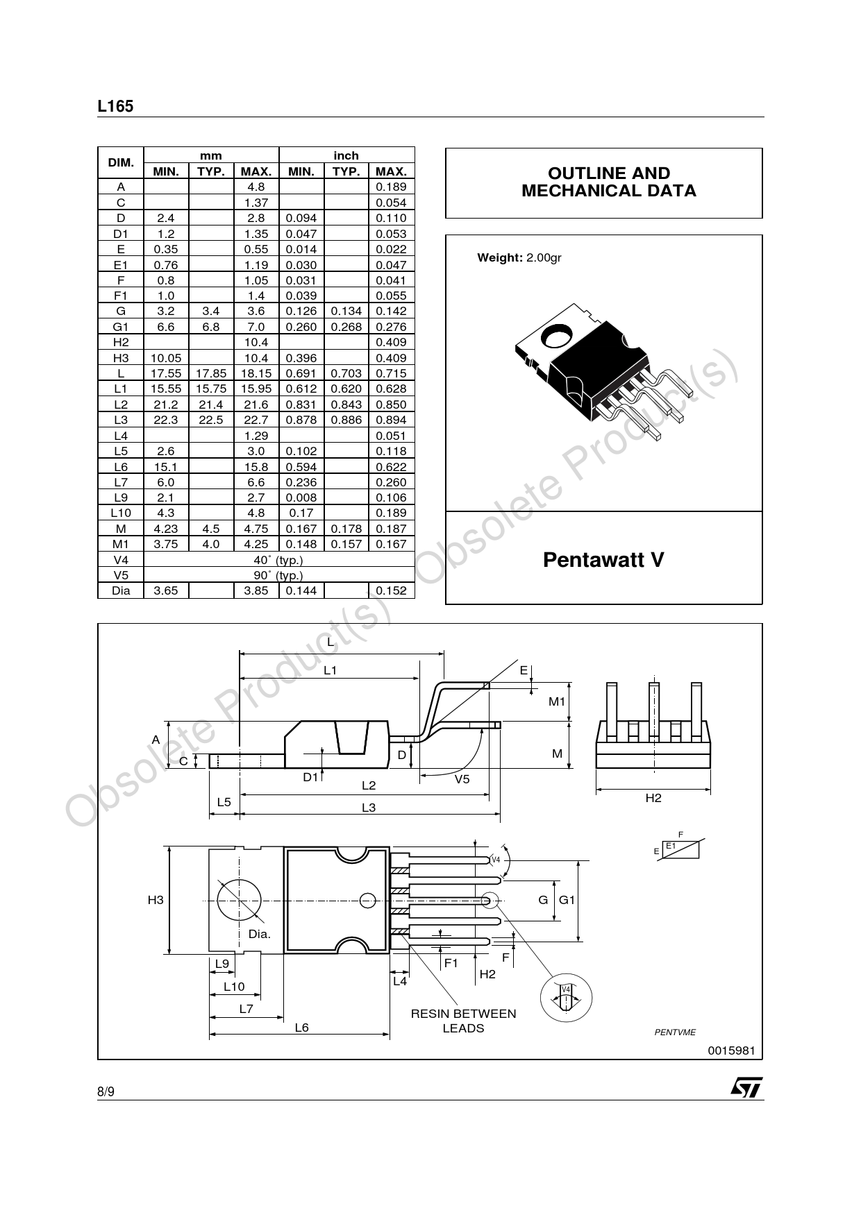 L165. inch. DIM. MIN. TYP. MAX. OUTLINE AND. MECHANICAL DATA. Weight:. Pentawatt V