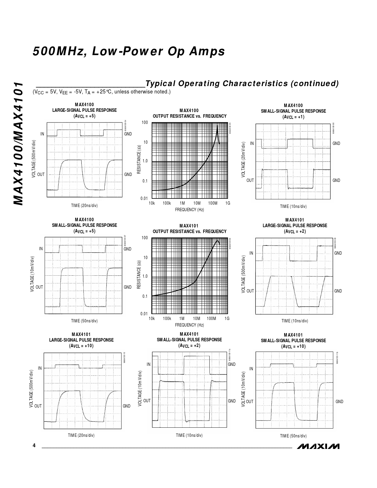 MAX4100 MAX4101 SMALL-SIGNAL PULSE RESPONSE MAX4101 LARGE-SIGNAL PULSE RESPONSE (AVCL = +5) OUTPUT RESISTANCE vs. FREQUENCY (AVCL = +2)