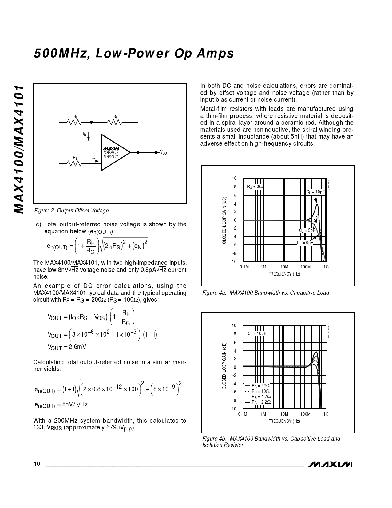 500MHz, Low-Power Op Amps In both DC and noise calculations, errors are dominat- ed by offset voltage and noise voltage (rather than by input bias current or noise current). Metal-film resistors with leads are manufactured using RI RF a thin-film process, where resistive material is deposit- ed in a spiral layer around a ceramic rod. Although the materials used are noninductive, the spiral winding pre- IB- sents a small inductance (about 5nH) that may have an adverse effect on high-frequency circuits. MAX4100 VOUT R I MAX4101 S B+ 10 8 RS = 0Ω MAX4100-4a CL = 10pF 6 4 MAX4100/MAX4101 Figure 3. Output Offset Voltage 2 0 c) Total output-referred noise voltage is shown by the -2 equation below (en(OUT)): CL = 5pF -4 R 2 2 CLOSED-LOOP GAIN (dB) C e F 1 i 2 R e -6 L = 0pF n OUT ( ) = + n S N RG ( ) +( ) -8 The MAX4100/MAX4101, with two high-impedance inputs, -10 0.1M 1M 10M 100M 1G have low 8nV√Hz voltage noise and only 0.8pA√Hz current FREQUENCY (Hz) noise. An example of DC error calculations, using the MAX4100/MAX4101 typical data and the typical operating Figure 4a. MAX4100 Bandwidth vs. Capacitive Load circuit with RF = RG = 200Ω (RS = 100Ω), gives: R V = I( R + V F ) OUT OS S OS 1+ RG 10 −6 2 −3 V 3 10 10 1 10 (1 ) C OUT = × × + × +1 8 L = 10pF MAX4100-4b 6 V = . 2 m 6 V OUT 4 2 Calculating total output-referred noise in a similar man- ner yields: 0 -2 − 2 2 -4 12 −9 R e (1 ) CLOSED-LOOP GAIN (dB) S = 22Ω n OUT ( ) = +1 2 × . 0 8 × 10 × 10 0 + 8 × 10 -6 RS = 10Ω RS = 4.7Ω -8 e = n 8 V / Hz RS = 2.2Ω n OUT ( ) -10 0.1M 1M 10M 100M 1G With a 200MHz system bandwidth, this calculates to FREQUENCY (Hz) 133µVRMS (approximately 679µVp-p). Figure 4b. MAX4100 Bandwidth vs. Capacitive Load and Isolation Resistor 10______________________________________________________________________________________