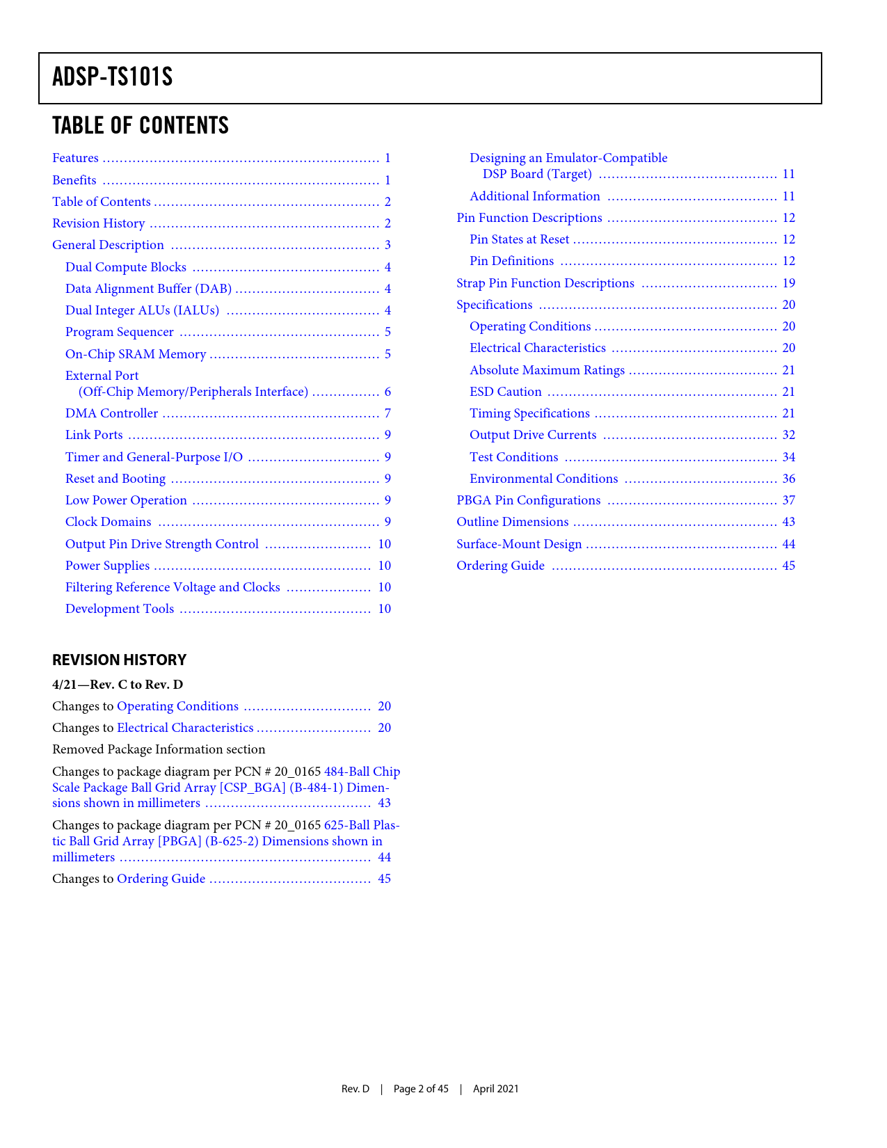 link to page 1 link to page 1 link to page 2 link to page 2 link to page 3 link to page 4 link to page 4 link to page 4 link to page 5 link to page 5 link to page 6 link to page 6 link to page 7 link to page 9 link to page 9 link to page 9 link to page 9 link to page 9 link to page 10 link to page 10 link to page 10 link to page 10 link to page 11 link to page 11 link to page 11 link to page 12 link to page 12 link to page 12 link to page 19 link to page 20 link to page 20 link to page 20 link to page 21 link to page 21 link to page 21 link to page 32 link to page 34 link to page 36 link to page 37 link to page 43 link to page 44 link to page 45 link to page 20 link to page 20 link to page 44 link to page 44 link to page 44 link to page 45 link to page 43 link to page 43 link to page 43 ADSP-TS101STABLE OF CONTENTS Features ... 1 Designing an Emulator-Compatible Benefits ... 1 DSP Board (Target) .. 11 Table of Contents ... 2 Additional Information .. 11 Revision History .. 2 Pin Function Descriptions .. 12 General Description ... 3 Pin States at Reset .. 12 Dual Compute Blocks .. 4 Pin Definitions ... 12 Data Alignment Buffer (DAB) .. 4 Strap Pin Function Descriptions .. 19 Dual Integer ALUs (IALUs) .. 4 Specifications .. 20 Program Sequencer ... 5 Operating Conditions ... 20 On-Chip SRAM Memory .. 5 Electrical Characteristics ... 20 External Port Absolute Maximum Ratings ... 21 (Off-Chip Memory/Peripherals Interface) .. 6 ESD Caution .. 21 DMA Controller ... 7 Timing Specifications ... 21 Link Ports ... 9 Output Drive Currents ... 32 Timer and General-Purpose I/O ... 9 Test Conditions .. 34 Reset and Booting ... 9 Environmental Conditions .. 36 Low Power Operation .. 9 PBGA Pin Configurations .. 37 Clock Domains .. 9 Outline Dimensions .. 43 Output Pin Drive Strength Control ... 10 Surface-Mount Design ... 44 Power Supplies ... 10 Ordering Guide ... 45 Filtering Reference Voltage and Clocks .. 10 Development Tools ... 10 REVISION HISTORY4/21—Rev. C to Rev. D Changes to Operating Conditions .. 20 Changes to Electrical Characteristics ... 20 Removed Package Information section Changes to package diagram per PCN # 20_0165 484-Ball Chip Scale Package Ball Grid Array [CSP_BGA] (B-484-1) Dimen- sions shown in millimeters ... 43 Changes to package diagram per PCN # 20_0165 625-Ball Plas- tic Ball Grid Array [PBGA] (B-625-2) Dimensions shown in millimeters ... 44 Changes to Ordering Guide .. 45 Rev. D | Page 2 of 45 | April 2021 Document Outline TigerSHARC Embedded Processor Features Benefits Table of Contents Revision History General Description Dual Compute Blocks Data Alignment Buffer (DAB) Dual Integer ALUs (IALUs) Program Sequencer Interrupt Controller Flexible Instruction Set On-Chip SRAM Memory External Port (Off-Chip Memory/Peripherals Interface) Host Interface Multiprocessor Interface SDRAM Controller EPROM Interface DMA Controller Link Ports Timer and General-Purpose I/O Reset and Booting Low Power Operation Clock Domains Output Pin Drive Strength Control Power Supplies Filtering Reference Voltage and Clocks Development Tools Designing an Emulator-Compatible DSP Board (Target) Additional Information Pin Function Descriptions Pin States at Reset Pin Definitions Strap Pin Function Descriptions Specifications Operating Conditions Electrical Characteristics Absolute Maximum Ratings ESD Caution Timing Specifications General AC Timing Link Ports Data Transfer and Token Switch Timing Output Drive Currents Test Conditions Output Disable Time Output Enable Time Capacitive Loading Environmental Conditions Thermal Characteristics PBGA Pin Configurations Outline Dimensions Surface-Mount Design Ordering Guide