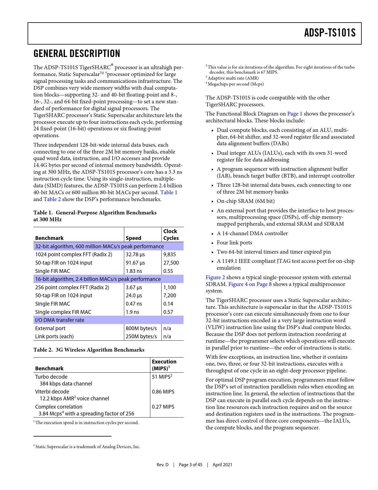 link to page 3 link to page 3 link to page 1 link to page 4 link to page 8 ADSP-TS101SGENERAL DESCRIPTION The ADSP-TS101S TigerSHARC® processor is an ultrahigh per- 2 This value is for six iterations of the algorithm. For eight iterations of the turbo formance, Static SuperscalarTM †processor optimized for large decoder, this benchmark is 67 MIPS. 3 Adaptive multi rate (AMR) signal processing tasks and communications infrastructure. The 4 Megachips per second (Mcps) DSP combines very wide memory widths with dual computa- tion blocks—supporting 32- and 40-bit floating-point and 8-, The ADSP-TS101S is code compatible with the other 16-, 32-, and 64-bit fixed-point processing—to set a new stan- TigerSHARC processors. dard of performance for digital signal processors. The TigerSHARC processor’s Static Superscalar architecture lets the The Functional Block Diagram on Page 1 shows the processor’s processor execute up to four instructions each cycle, performing architectural blocks. These blocks include: 24 fixed-point (16-bit) operations or six floating-point • Dual compute blocks, each consisting of an ALU, multi- operations. plier, 64-bit shifter, and 32-word register file and associated Three independent 128-bit-wide internal data buses, each data alignment buffers (DABs) connecting to one of the three 2M bit memory banks, enable • Dua l integer ALUs (IALUs) , each with its own 31-word quad word data, instruction, and I/O accesses and provide register file for data addressing 14.4G bytes per second of internal memory bandwidth. Operat- • A program sequencer with instruction alignment buffer ing at 300 MHz, the ADSP-TS101S processor’s core has a 3.3 ns (IAB), branch target buffer (BTB), and interrupt controller instruction cycle time. Using its single-instruction, multiple- data (SIMD) features, the ADSP-TS101S can perform 2.4 billion • Three 128-bit internal data buses, each connecting to one 40-bit MACs or 600 million 80-bit MACs per second. Table 1 of three 2M bit memory banks and Table 2 show the DSP’s performance benchmarks. • On-chip SRAM (6M bit) • An external port that provides the interface to host proces- Table 1. General-Purpose Algorithm Benchmarks sors, multiprocessing space (DSPs), off-chip memory- at 300 MHz mapped peripherals, and external SRAM and SDRAM Clock • A 14-channel DMA controller BenchmarkSpeedCycles • Four link ports 32-bit algorithm, 600 million MACs/s peak performance • Two 64-bit interval timers and timer expired pin 1024 point complex FFT (Radix 2) 32.78 μs 9,835 • A 1149.1 IEEE compliant JTAG test access port for on-chip 50-tap FIR on 1024 input 91.67 μs 27,500 emulation Single FIR MAC 1.83 ns 0.55 Figure 2 shows a typical single-processor system with external 16-bit algorithm, 2.4 billion MACs/s peak performance SDRAM. Figure 4 on Page 8 shows a typical multiprocessor 256 point complex FFT (Radix 2) 3.67 μs 1,100 system. 50-tap FIR on 1024 input 24.0 μs 7,200 The TigerSHARC processor uses a Static Superscalar architec- Single FIR MAC 0.47 ns 0.14 ture. This architecture is superscalar in that the ADSP-TS101S Single complex FIR MAC 1.9 ns 0.57 processor’s core can execute simultaneously from one to four I/O DMA transfer rate 32-bit instructions encoded in a very large instruction word External port 800M bytes/s n/a (VLIW) instruction line using the DSP’s dual compute blocks. Because the DSP does not perform instruction reordering at Link ports (each) 250M bytes/s n/a runtime—the programmer selects which operations will execute in parallel prior to runtime—the order of instructions is static. Table 2. 3G Wireless Algorithm Benchmarks With few exceptions, an instruction line, whether it contains Execution one, two, three, or four 32-bit instructions, executes with a Benchmark(MIPS)1 throughput of one cycle in an eight-deep processor pipeline. Turbo decode 51 MIPS2 For optimal DSP program execution, programmers must follow 384 kbps data channel the DSP’s set of instruction parallelism rules when encoding an Viterbi decode 0.86 MIPS instruction line. In general, the selection of instructions that the 12.2 kbps AMR3 voice channel DSP can execute in parallel each cycle depends on the instruc- Complex correlation 0.27 MIPS tion line resources each instruction requires and on the source 3.84 Mcps4 with a spreading factor of 256 and destination registers used in the instructions. The program- 1 mer has direct control of three core components—the IALUs, The execution speed is in instruction cycles per second. the compute blocks, and the program sequencer. † Static Superscalar is a trademark of Analog Devices, Inc. Rev. D | Page 3 of 45 | April 2021 Document Outline TigerSHARC Embedded Processor Features Benefits Table of Contents Revision History General Description Dual Compute Blocks Data Alignment Buffer (DAB) Dual Integer ALUs (IALUs) Program Sequencer Interrupt Controller Flexible Instruction Set On-Chip SRAM Memory External Port (Off-Chip Memory/Peripherals Interface) Host Interface Multiprocessor Interface SDRAM Controller EPROM Interface DMA Controller Link Ports Timer and General-Purpose I/O Reset and Booting Low Power Operation Clock Domains Output Pin Drive Strength Control Power Supplies Filtering Reference Voltage and Clocks Development Tools Designing an Emulator-Compatible DSP Board (Target) Additional Information Pin Function Descriptions Pin States at Reset Pin Definitions Strap Pin Function Descriptions Specifications Operating Conditions Electrical Characteristics Absolute Maximum Ratings ESD Caution Timing Specifications General AC Timing Link Ports Data Transfer and Token Switch Timing Output Drive Currents Test Conditions Output Disable Time Output Enable Time Capacitive Loading Environmental Conditions Thermal Characteristics PBGA Pin Configurations Outline Dimensions Surface-Mount Design Ordering Guide