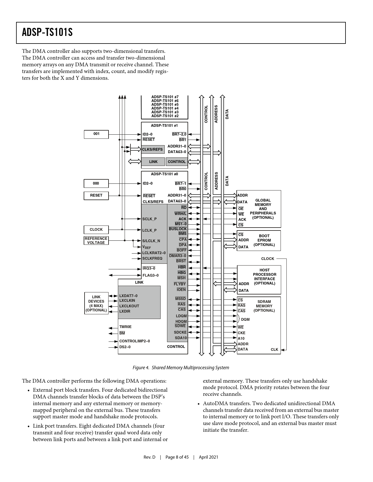 ADSP-TS101 #7 ADSP-TS101 #6 ADSP-TS101 #5 L S ADSP-TS101 #4 O S ADSP-TS101 #3 R E A T R T ADSP-TS101 #2 N D A O D D C A ADSP-TS101 #1 001 ID2–0 BR7–2,0 RESET BR1 ADDR31–0 CLKS/REFS DATA63–0 LINK CONTROL ADSP-TS101 #0 L S O S R E A T R T 000 ID2–0 BR7–1 N D A O D D BR0 C A RESET RESET ADDR31–0 ADDR CLKS/REFS DATA63–0 GLOBAL DATA MEMORY RD OE AND WRH/L PERIPHERALS WE SCLK_P (OPTIONAL) ACK ACK MS1–0 CS CLOCK BUSLOCK LCLK_P BMS CS BOOT REFERENCE CPA S/LCLK_N ADDR EPROM VOLTAGE DPA (OPTIONAL) VREF DATA BOFF LCLKRAT2–0 DMAR3–0 SCLKFREQ CLOCK BRST HBR IRQ3–0 HOST HBG PROCESSOR FLAG3–0 MSH INTERFACE LINK FLYBY ADDR (OPTIONAL) IOEN DATA LINK LXDAT7–0 MSSD LXCLKIN CS DEVICES SDRAM RAS (4 MAX) LXCLKOUT RAS MEMORY (OPTIONAL) CAS LXDIR CAS (OPTIONAL) LDQM DQM HDQM SDWE TMR0E WE SDCKE BM CKE SDA10 A10 CONTROLIMP2–0 ADDR DS2–0 CONTROL DATA CLK