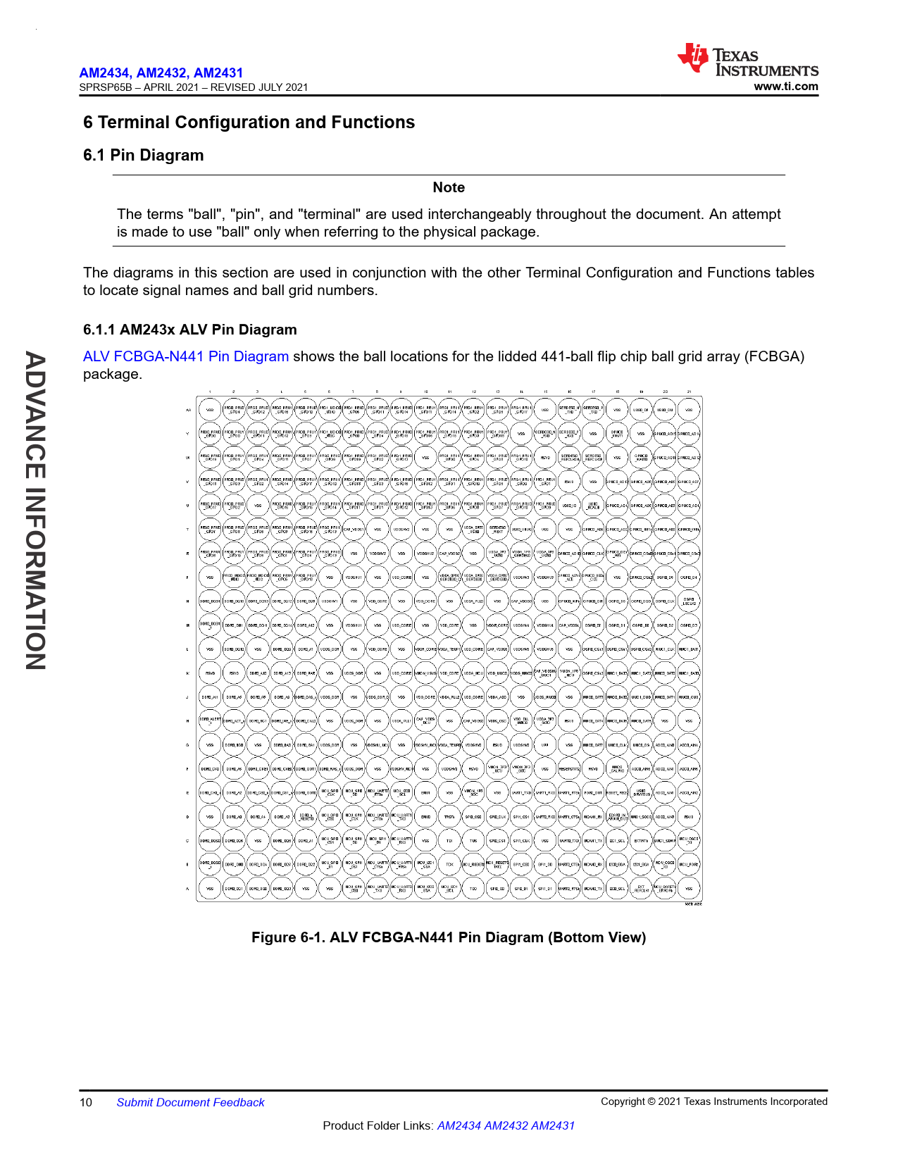 AM2434. , AM2432, AM2431. www.ti.com. 6 Terminal Configuration and Functions. 6.1 Pin Diagram. Note. 6.1.1 AM243x ALV Pin Diagram