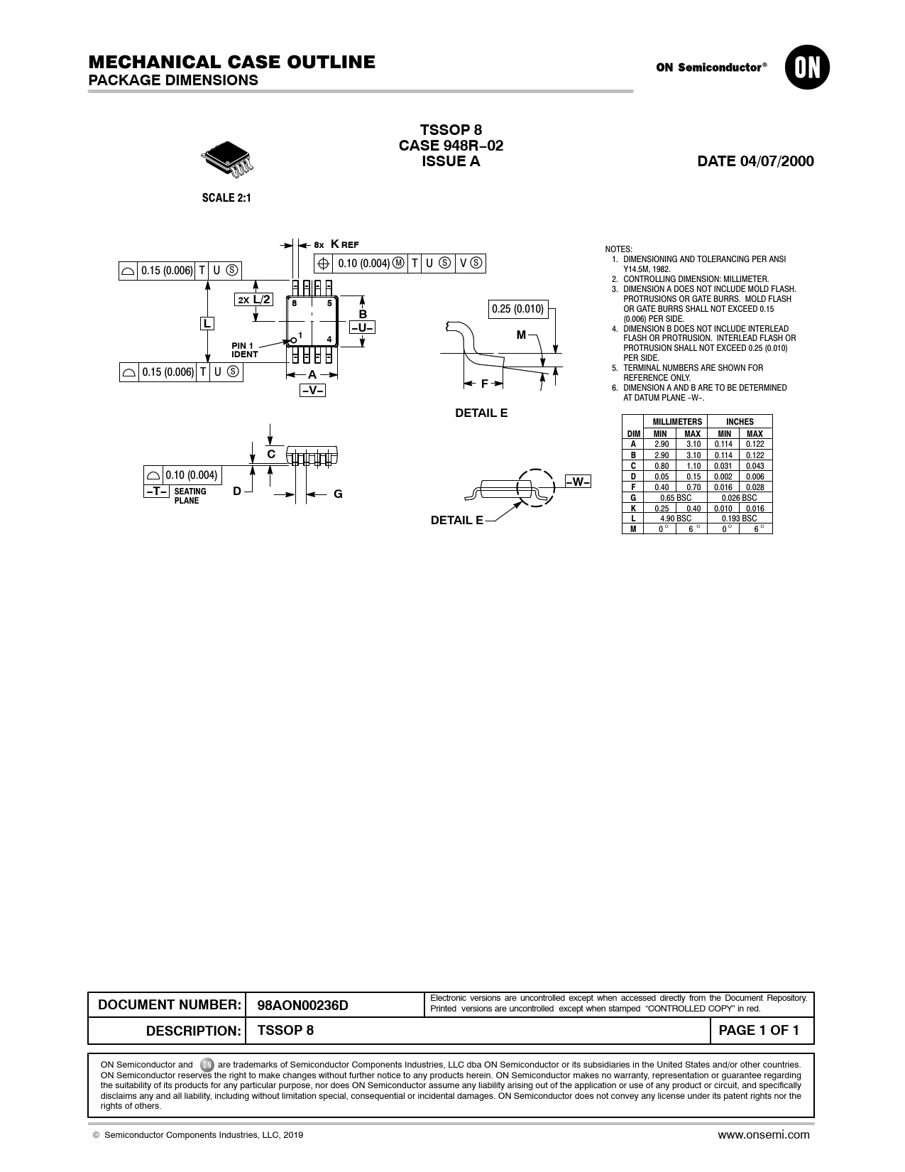 PACKAGE DIMENSIONS. TSSOP 8. CASE 948R−02. ISSUE A. DATE 04/07/2000. SCALE 2:1. 8x REF. 2X L/2. −U−. PIN 1. IDENT. −V−. DETAIL E. MILLIMETERS