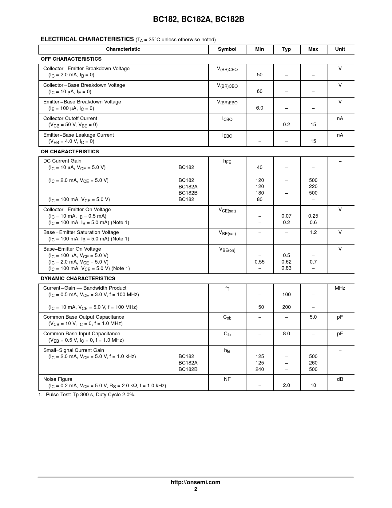 BC182, BC182A, BC182B. ELECTRICAL CHARACTERISTICS. Characteristic. Symbol. Min. Typ. Max. Unit. OFF CHARACTERISTICS. ON CHARACTERISTICS