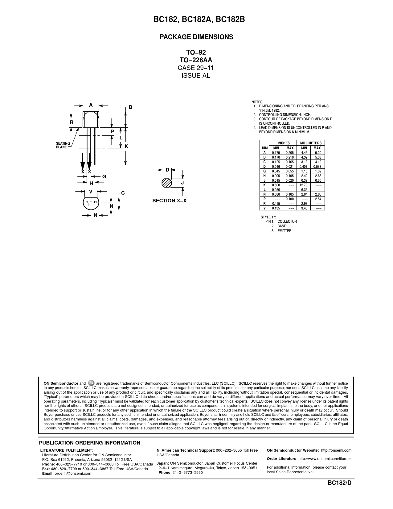 BC182, BC182A, BC182BPACKAGE DIMENSIONSTO−92TO−226AA CASE 29−11 ISSUE AL NOTES: A 1. DIMENSIONING AND TOLERANCING PER ANSI B Y14.5M, 1982. 2. CONTROLLING DIMENSION: INCH. 3. CONTOUR OF PACKAGE BEYOND DIMENSION R R IS UNCONTROLLED. 4. LEAD DIMENSION IS UNCONTROLLED IN P AND P BEYOND DIMENSION K MINIMUM. L SEATING INCHES MILLIMETERS PLANE K DIM MIN MAX MIN MAX A 0.175 0.205 4.45 5.20 B 0.170 0.210 4.32 5.33 C 0.125 0.165 3.18 4.19 D 0.016 0.021 0.407 0.533 DX X G 0.045 0.055 1.15 1.39 G H 0.095 0.105 2.42 2.66 J 0.015 0.020 0.39 0.50 HJ K 0.500 −−− 12.70 −−− V L 0.250 −−− 6.35 −−− C N 0.080 0.105 2.04 2.66 SECTION X−X P −−− 0.100 −−− 2.54 R 1 N 0.115 −−− 2.93 −−− V 0.135 −−− 3.43 −−− N STYLE 17: PIN 1. COLLECTOR 2. BASE 3. EMITTER ON Semiconductor and are registered trademarks of Semiconductor Components Industries, LLC (SCILLC). SCILLC reserves the right to make changes without further notice to any products herein. SCILLC makes no warranty, representation or guarantee regarding the suitability of its products for any particular purpose, nor does SCILLC assume any liability arising out of the application or use of any product or circuit, and specifically disclaims any and all liability, including without limitation special, consequential or incidental damages. “Typical” parameters which may be provided in SCILLC data sheets and/or specifications can and do vary in different applications and actual performance may vary over time. All operating parameters, including “Typicals” must be validated for each customer application by customer’s technical experts. SCILLC does not convey any license under its patent rights nor the rights of others. SCILLC products are not designed, intended, or authorized for use as components in systems intended for surgical implant into the body, or other applications intended to support or sustain life, or for any other application in which the failure of the SCILLC product could create a situation where personal injury or death may occur. Should Buyer purchase or use SCILLC products for any such unintended or unauthorized application, Buyer shall indemnify and hold SCILLC and its officers, employees, subsidiaries, affiliates, and distributors harmless against all claims, costs, damages, and expenses, and reasonable attorney fees arising out of, directly or indirectly, any claim of personal injury or death associated with such unintended or unauthorized use, even if such claim alleges that SCILLC was negligent regarding the design or manufacture of the part. SCILLC is an Equal Opportunity/Affirmative Action Employer. This literature is subject to all applicable copyright laws and is not for resale in any manner. PUBLICATION ORDERING INFORMATIONLITERATURE FULFILLMENT : N. American Technical Support : 800−282−9855 Toll Free ON Semiconductor Website : http://onsemi.com Literature Distribution Center for ON Semiconductor USA/Canada P.O. Box 61312, Phoenix, Arizona 85082−1312 USA Order Literature : http://www.onsemi.com/litorder Japan : ON Semiconductor, Japan Customer Focus Center Phone : 480−829−7710 or 800−344−3860 Toll Free USA/Canada 2−9−1 Kamimeguro, Meguro−ku, Tokyo, Japan 153−0051 Fax : 480−829−7709 or 800−344−3867 Toll Free USA/Canada For additional information, please contact your Email : orderlit@onsemi.com Phone : 81−3−5773−3850 local Sales Representative. http://onsemi.comBC182/D4