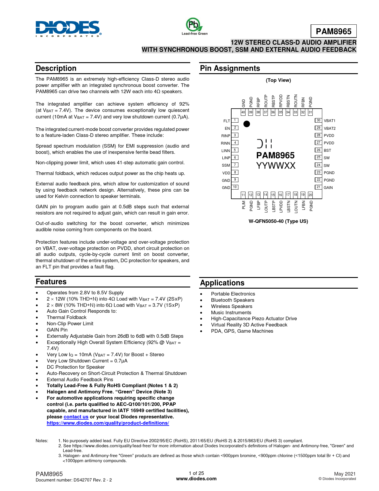 PAM8965. 12W STEREO CLASS-D AUDIO AMPLIFIER. WITH SYNCHRONOUS BOOST, SSM AND EXTERNAL AUDIO FEEDBACK. Description