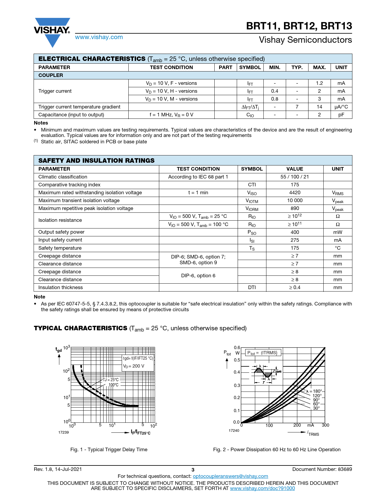 BRT11, BRT12, BRT13. ELECTRICAL CHARACTERISTICS. PARAMETER. TEST CONDITION. PART. SYMBOL. MIN. TYP. MAX. UNIT. COUPLER. Notes