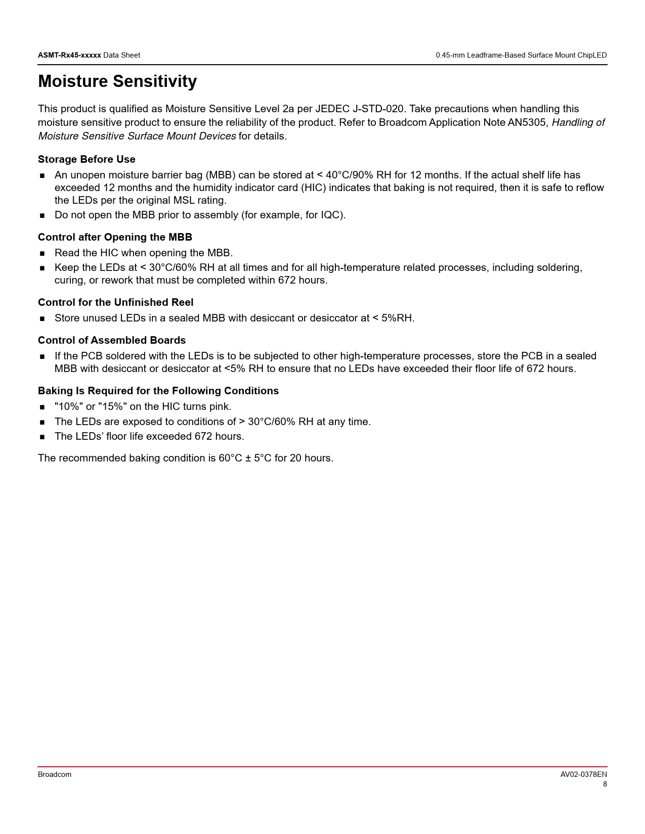 ASMT-Rx45-xxxxx Data Sheet 0.45-mm Leadframe-Based Surface Mount ChipLED Moisture Sensitivity This product is qualified as Moisture Sensitive Level 2a per JEDEC J-STD-020. Take precautions when handling this moisture sensitive product to ensure the reliability of the product. Refer to Broadcom Application Note AN5305, Handling of Moisture Sensitive Surface Mount Devices for details. Storage Before Use An unopen moisture barrier bag (MBB) can be stored at < 40°C/90% RH for 12 months. If the actual shelf life has exceeded 12 months and the humidity indicator card (HIC) indicates that baking is not required, then it is safe to reflow the LEDs per the original MSL rating. Do not open the MBB prior to assembly (for example, for IQC). Control after Opening the MBB Read the HIC when opening the MBB. Keep the LEDs at < 30°C/60% RH at all times and for all high-temperature related processes, including soldering, curing, or rework that must be completed within 672 hours. Control for the Unfinished Reel Store unused LEDs in a sealed MBB with desiccant or desiccator at < 5%RH. Control of Assembled Boards If the PCB soldered with the LEDs is to be subjected to other high-temperature processes, store the PCB in a sealed MBB with desiccant or desiccator at <5% RH to ensure that no LEDs have exceeded their floor life of 672 hours. Baking Is Required for the Following Conditions "10%" or "15%" on the HIC turns pink. The LEDs are exposed to conditions of > 30°C/60% RH at any time. The LEDs’ floor life exceeded 672 hours. The recommended baking condition is 60°C ± 5°C for 20 hours. Broadcom AV02-0378EN 8 Document Outline Description Features Applications Package Dimensions Device Selection Guide Part Numbering System Absolute Maximum Ratings at TA = 25°C Electrical Characteristics at TA = 25°C Optical Characteristics at TA = 25°C Intensity Bin Select (X3X4) Light Intensity (IV) Bin Limits Color Bin Select (X5) Packaging Option (X6) Forward Voltage (VF) Bin Limits Color Bin Limits Yellow Green Color Bin Yellow/Amber Color Bin Orange Color Bin Red Color Bin Red Orange Color Bin Moisture Sensitivity