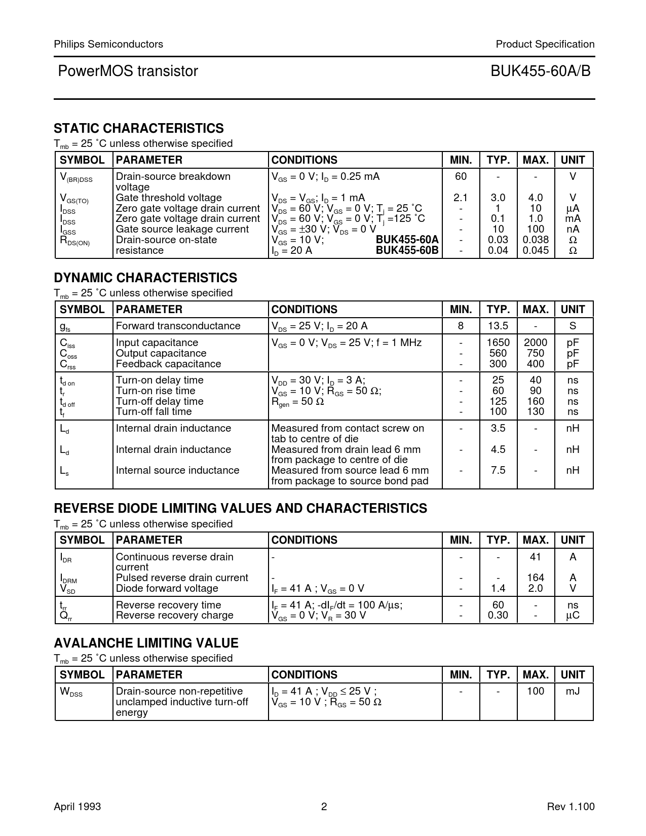 STATIC CHARACTERISTICS. SYMBOL. PARAMETER. CONDITIONS. MIN. TYP. MAX. UNIT. BUK455-60A. BUK455-60B. DYNAMIC CHARACTERISTICS