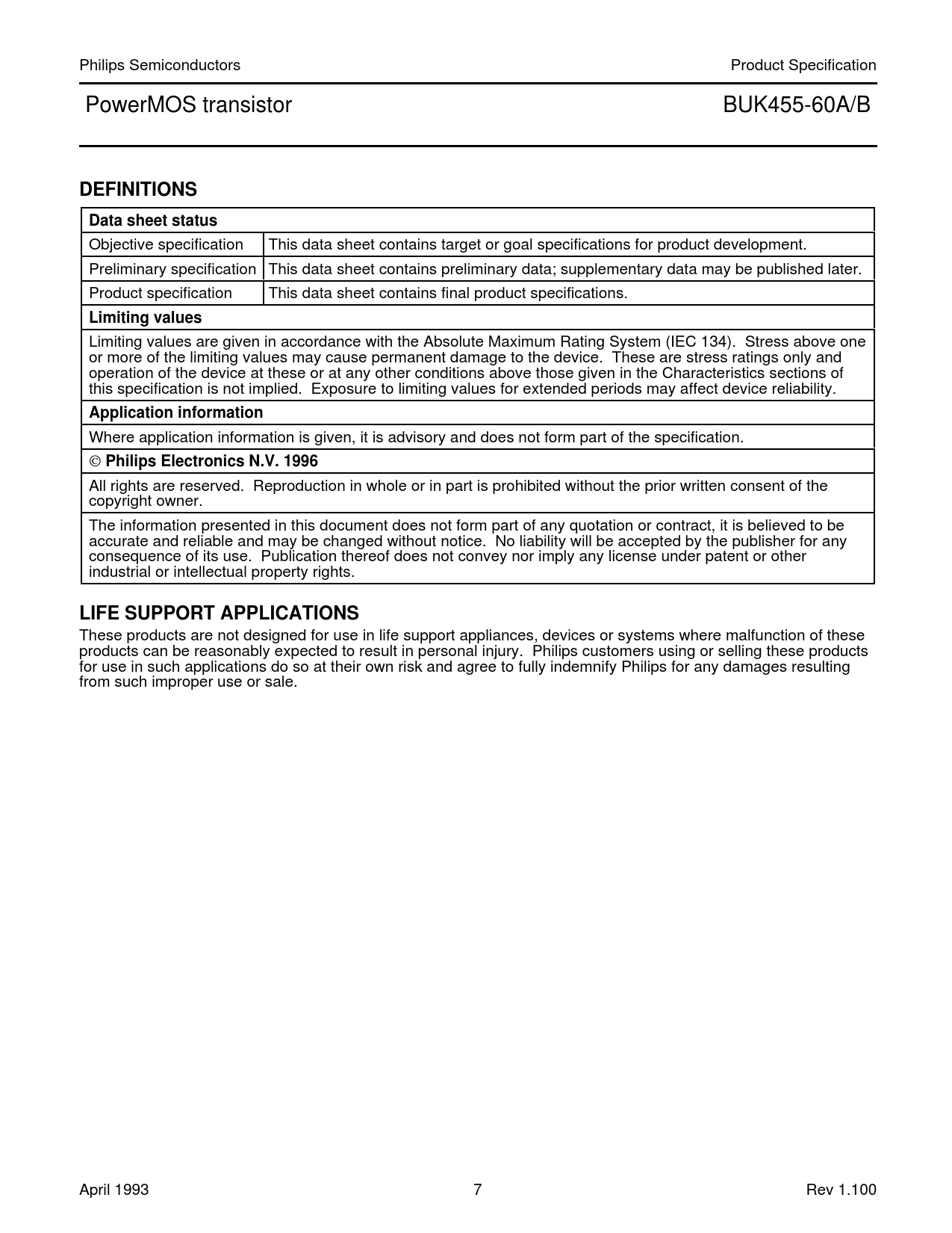 DEFINITIONS Data sheet status Limiting values Application information Philips Electronics N.V 1996