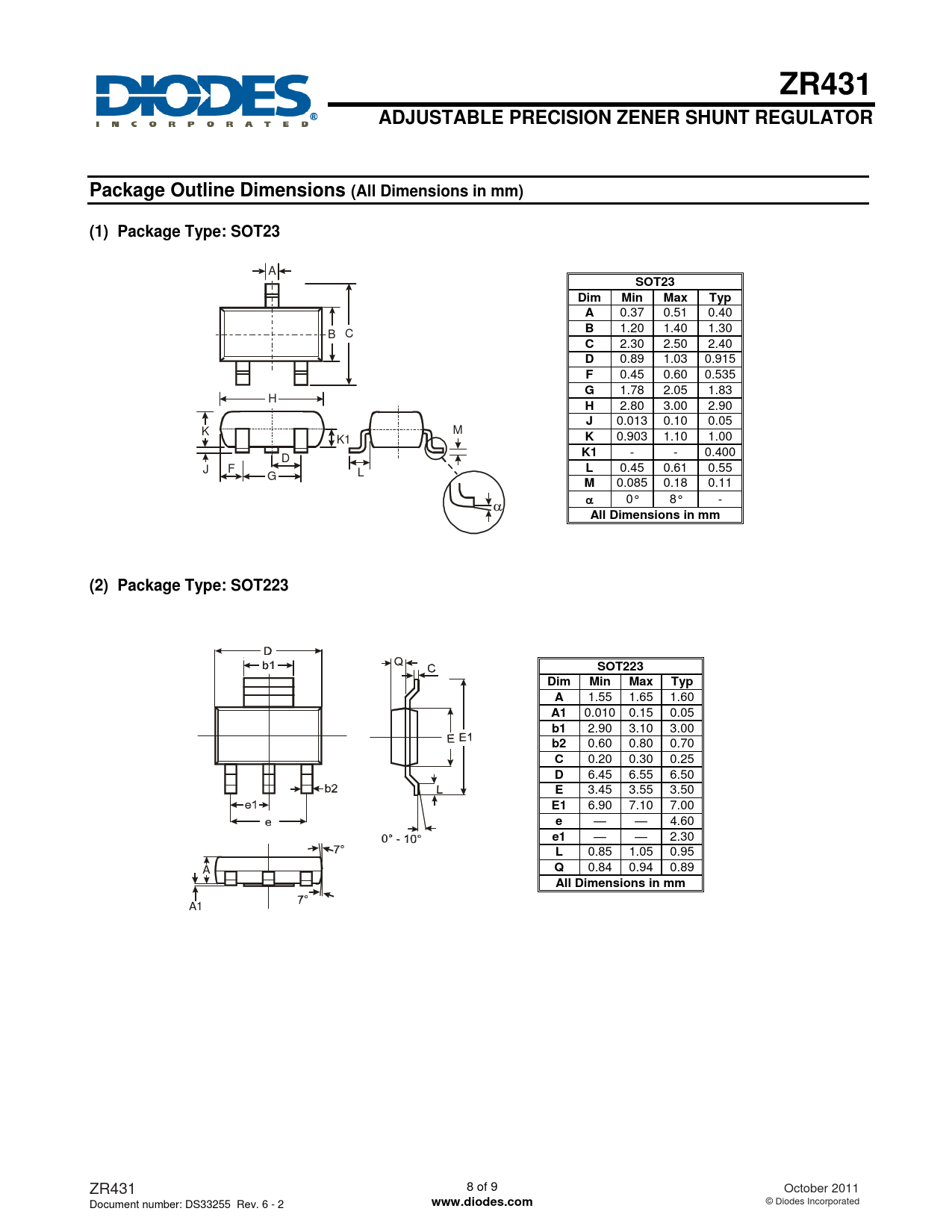 ZR431. ADJUSTABLE PRECISION ZENER SHUNT REGULATOR. Package Outline Dimensions (All Dimensions in mm). (1) Package Type: SOT23