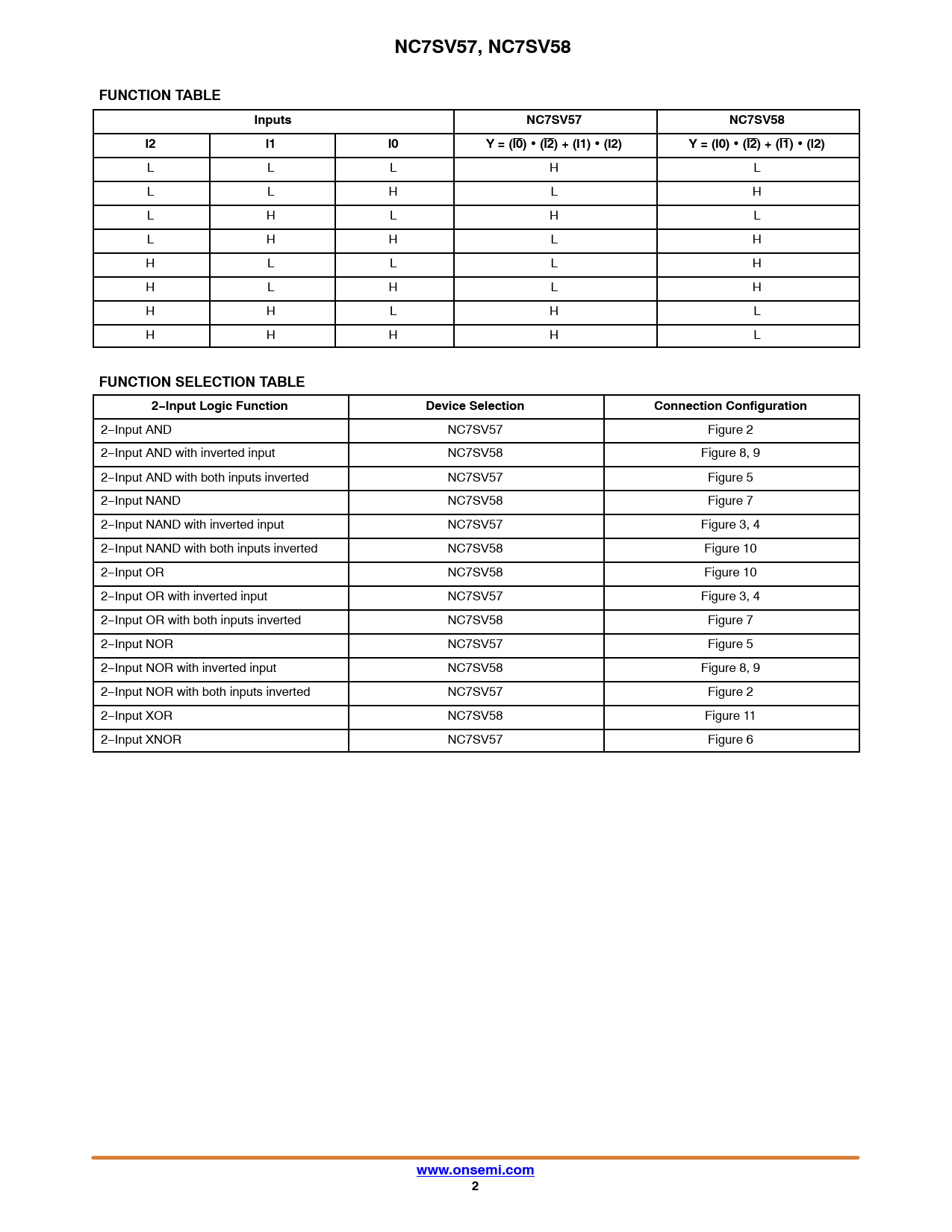NC7SV57, NC7SV58. FUNCTION TABLE. Inputs. NC7SV57. NC7SV58. Y = (I0). (I2) + (I1). (I2). FUNCTION SELECTION TABLE. 2−Input Logic Function