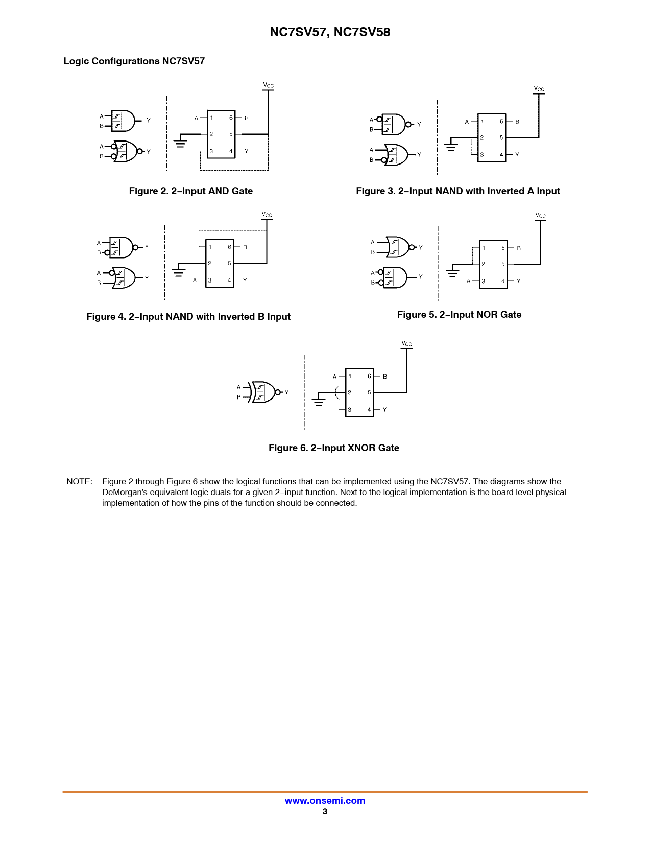 NOTE: Figure 2 through Figure 6 show the logical functions that can be implemented using the NC7SV57. The diagrams show the DeMorgan’s equivalent logic duals for a given 2−input function. Next to the logical implementation is the board level physical implementation of how the pins of the function should be connected.