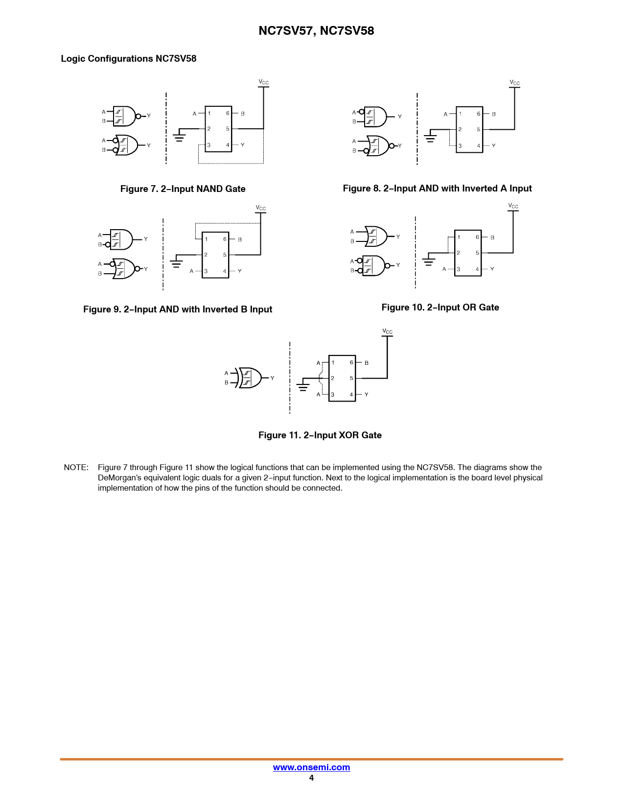 NC7SV57, NC7SV58 Logic Configurations NC7SV58 Figure 7. 2−Input NAND Gate Figure 8. 2−Input AND with Inverted A Input Figure 9. 2−Input AND with Inverted B Input Figure 10. 2−Input OR Gate Figure 11. 2−Input XOR Gate