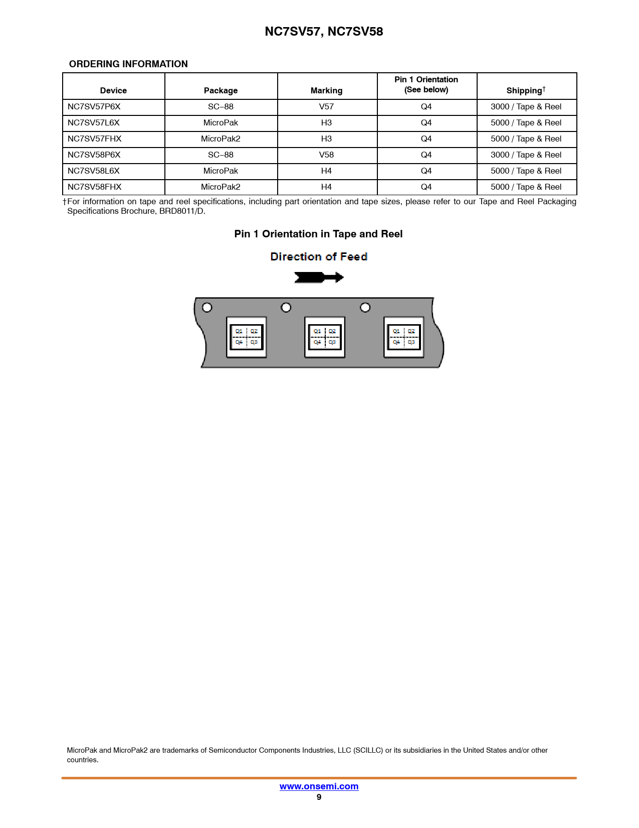 † NC7SV57P6X SC−88 V57 Q4 3000 / Tape & Reel NC7SV57L6X MicroPak H3 Q4 5000 / Tape & Reel NC7SV57FHX MicroPak2 H3 Q4 5000 / Tape & Reel NC7SV58P6X SC−88 V58 Q4 3000 / Tape & Reel NC7SV58L6X MicroPak H4 Q4 5000 / Tape & Reel NC7SV58FHX MicroPak2 H4 Q4 5000 / Tape & Reel †For information on tape and reel specifications, including part orientation and tape sizes, please refer to our Tape and Reel Packaging Specifications Brochure, BRD8011/D.