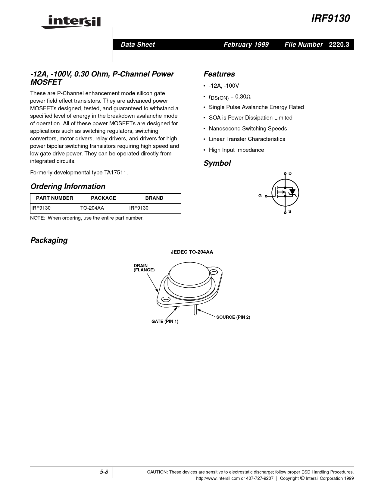 IRF9130. Data Sheet. February 1999. File Number. 2220.3. -12A, -100V, 0.30 Ohm, P-Channel Power. Features. MOSFET. Symbol