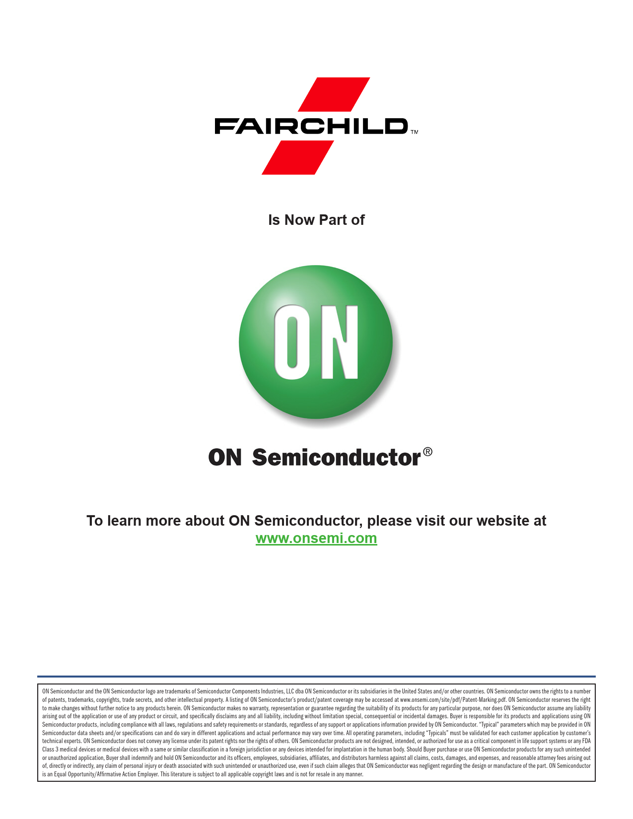 Is Now Part of To learn more about ON Semiconductor, please visit our website at www.onsemi.com ON Semiconductor and the ON Semiconductor logo are trademarks of Semiconductor Components Industries, LLC dba ON Semiconductor or its subsidiaries in the United States and/or other countries. ON Semiconductor owns the rights to a number of patents, trademarks, copyrights, trade secrets, and other intellectual property. A listing of ON Semiconductor’s product/patent coverage may be accessed at www.onsemi.com/site/pdf/Patent-Marking.pdf. ON Semiconductor reserves the right to make changes without further notice to any products herein. ON Semiconductor makes no warranty, representation or guarantee regarding the suitability of its products for any particular purpose, nor does ON Semiconductor assume any liability arising out of the application or use of any product or circuit, and specifically disclaims any and all liability, including without limitation special, consequential or incidental damages. Buyer is responsible for its products and applications using ON Semiconductor products, including compliance with all laws, regulations and safety requirements or standards, regardless of any support or applications information provided by ON Semiconductor. “Typical” parameters which may be provided in ON Semiconductor data sheets and/or specifications can and do vary in different applications and actual performance may vary over time. All operating parameters, including “Typicals” must be validated for each customer application by customer’s technical experts. ON Semiconductor does not convey any license under its patent rights nor the rights of others. ON Semiconductor products are not designed, intended, or authorized for use as a critical component in life support systems or any FDA Class 3 medical devices or medical devices with a same or similar classification in a foreign jurisdiction or any devices intended for implantation in the human body. Should Buyer purchase or use ON Semiconductor products for any such unintended or unauthorized application, Buyer shall indemnify and hold ON Semiconductor and its officers, employees, subsidiaries, affiliates, and distributors harmless against all claims, costs, damages, and expenses, and reasonable attorney fees arising out of, directly or indirectly, any claim of personal injury or death associated with such unintended or unauthorized use, even if such claim alleges that ON Semiconductor was negligent regarding the design or manufacture of the part. ON Semiconductor is an Equal Opportunity/Affirmative Action Employer. This literature is subject to all applicable copyright laws and is not for resale in any manner.