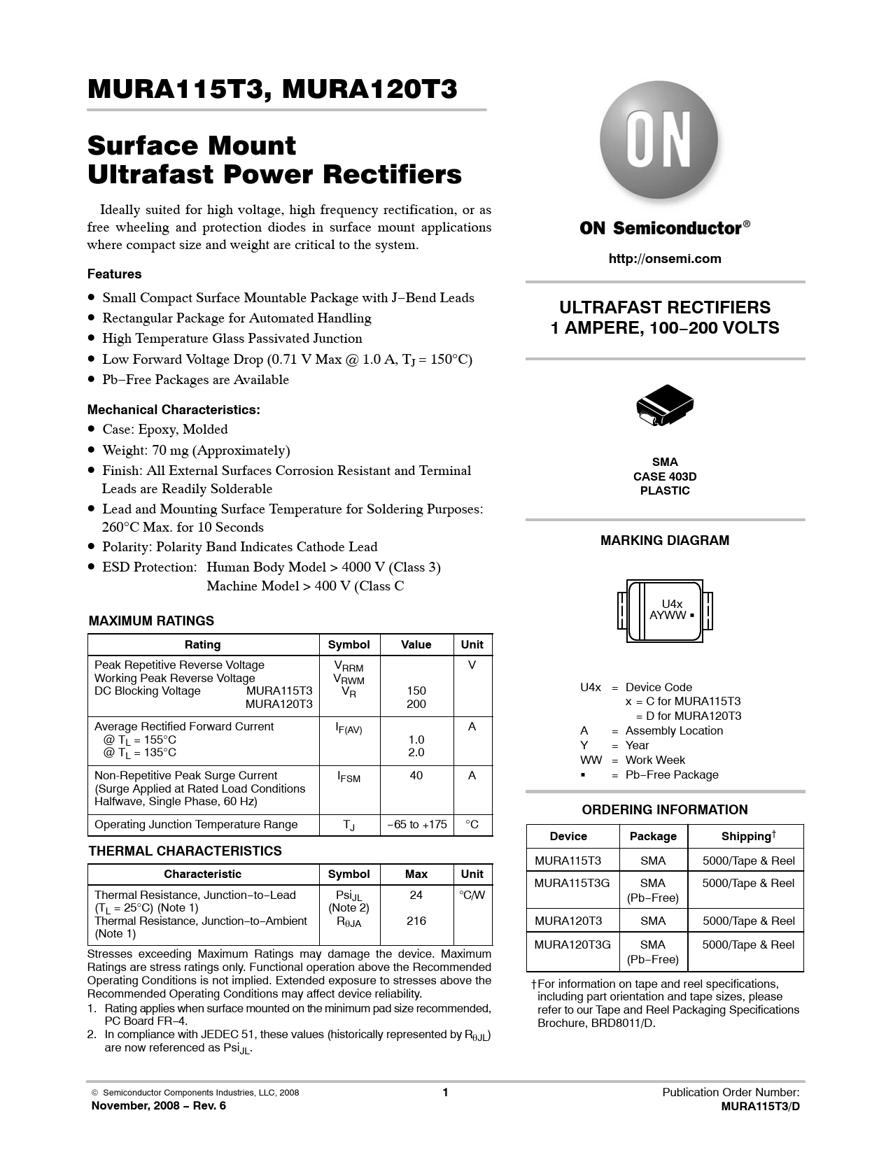 November, 2008 − Rev. 6 MURA115T3/D