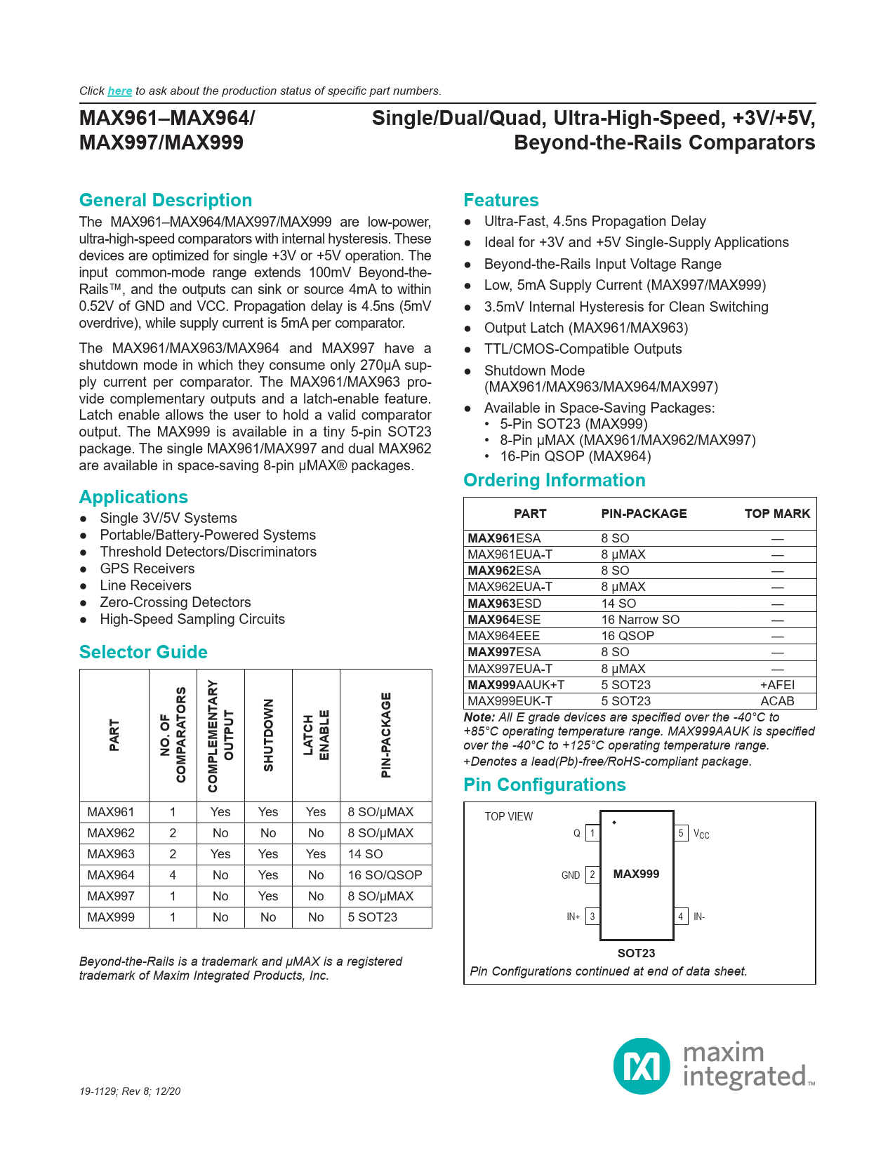 Click here to ask about the production status of specific part numbers. MAX961–MAX964/Single/Dual/Quad, Ultra-High-Speed, +3V/+5V,MAX997/MAX999Beyond-the-Rails ComparatorsGeneral DescriptionFeatures The MAX961–MAX964/MAX997/MAX999 are low-power, ● Ultra-Fast, 4.5ns Propagation Delay ultra-high-speed comparators with internal hysteresis. These ● Ideal for +3V and +5V Single-Supply Applications devices are optimized for single +3V or +5V operation. The input common-mode range extends 100mV Beyond-the- ● Beyond-the-Rails Input Voltage Range Rails™, and the outputs can sink or source 4mA to within ● Low, 5mA Supply Current (MAX997/MAX999) 0.52V of GND and VCC. Propagation delay is 4.5ns (5mV ● 3.5mV Internal Hysteresis for Clean Switching overdrive), while supply current is 5mA per comparator. ● Output Latch (MAX961/MAX963) The MAX961/MAX963/MAX964 and MAX997 have a ● TTL/CMOS-Compatible Outputs shutdown mode in which they consume only 270μA sup- ● Shutdown Mode ply current per comparator. The MAX961/MAX963 pro- (MAX961/MAX963/MAX964/MAX997) vide complementary outputs and a latch-enable feature. Latch enable allows the user to hold a valid comparator ● Available in Space-Saving Packages: output. The MAX999 is available in a tiny 5-pin SOT23 • 5-Pin SOT23 (MAX999) package. The single MAX961/MAX997 and dual MAX962 • 8-Pin μMAX (MAX961/MAX962/MAX997) are available in space-saving 8-pin μMAX® packages. • 16-Pin QSOP (MAX964) Ordering InformationApplications ● Single 3V/5V Systems PARTPIN-PACKAGETOP MARK ● Portable/Battery-Powered Systems MAX961 ESA 8 SO — ● Threshold Detectors/Discriminators MAX961EUA-T 8 µMAX — ● GPS Receivers MAX962 ESA 8 SO — ● Line Receivers MAX962EUA-T 8 µMAX — ● Zero-Crossing Detectors MAX963 ESD 14 SO — ● High-Speed Sampling Circuits MAX964 ESE 16 Narrow SO — MAX964EEE 16 QSOP — Selector GuideMAX997 ESA 8 SO — MAX997EUA-T 8 µMAX — YMAX999 AAUK+T 5 SOT23 +AFEI AR MAX999EUK-T 5 SOT23 ACAB TORSNote: All E grade devices are specified over the -40°C to +85°C operating temperature range. MAX999AAUK is specified TCHPARTARAACKAGE over the -40°C to +125°C operating temperature range. NO. OFOUTPUTLA ENABLE +Denotes a lead(Pb)-free/RoHS-compliant package. SHUTDOWNCOMPPIN-PCOMPLEMENTPin Configurations MAX961 1 Yes Yes Yes 8 SO/μMAX TOP VIEW MAX962 2 No No No 8 SO/μMAX Q 1 5 VCC MAX963 2 Yes Yes Yes 14 SO MAX964 4 No Yes No 16 SO/QSOP GND 2 MAX999 MAX997 1 No Yes No 8 SO/μMAX MAX999 1 No No No 5 SOT23 IN+ 3 4 IN- Beyond-the-Rails is a trademark and μMAX is a registered SOT23 trademark of Maxim Integrated Products, Inc. Pin Configurations continued at end of data sheet. 19-1129; Rev 8; 12/20