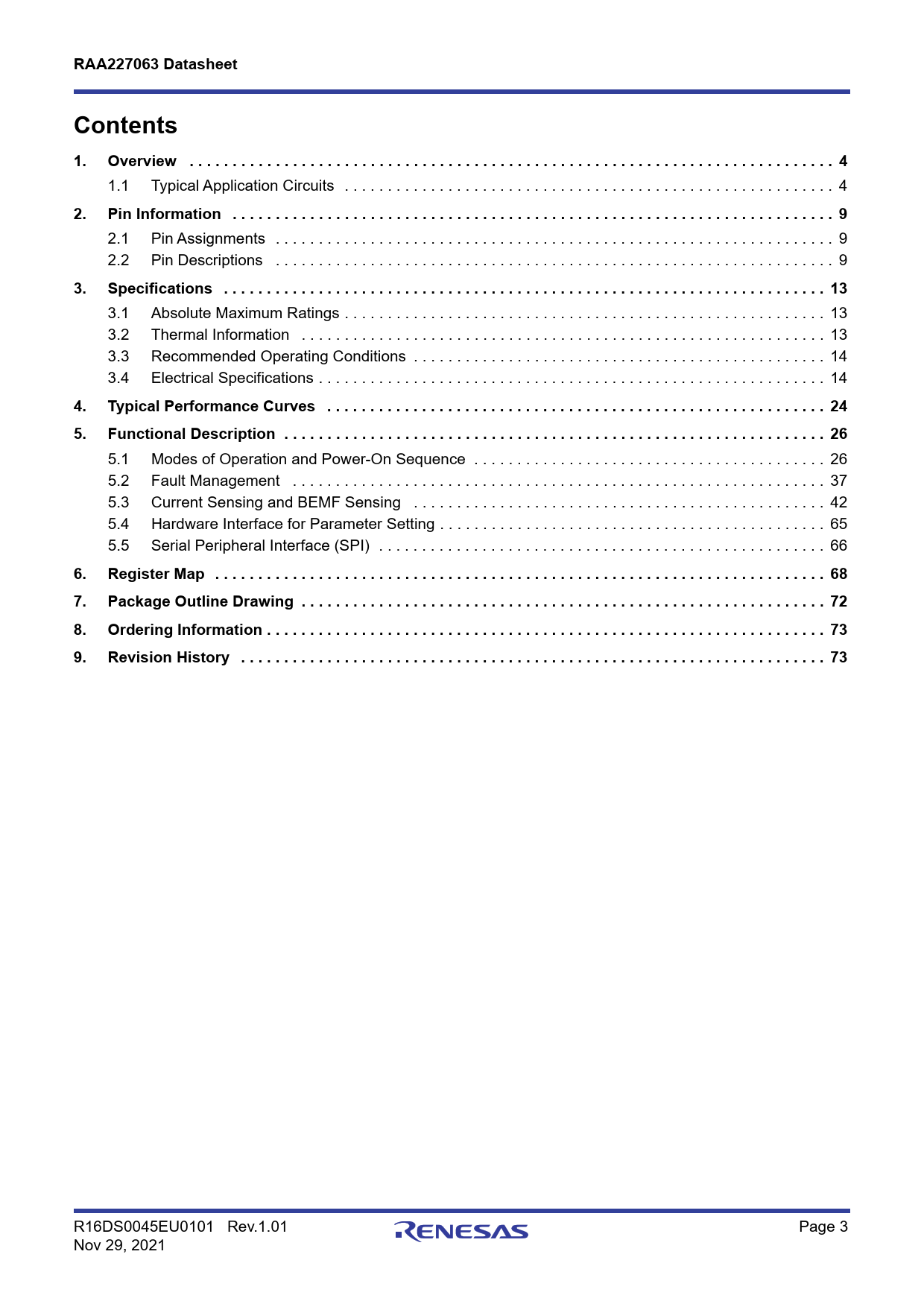 | 页数 / 页 | 74 / 3 — RAA227063 Datasheet. Contents 1. Overview . 4. Pin Information . 9. … |