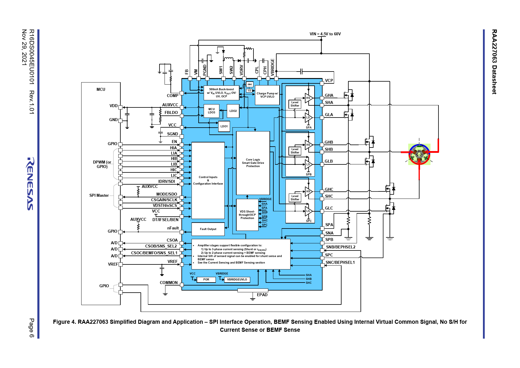 Figure 4. RAA227063 Simplified Diagram and Application – SPI Interface Operation, BEMF Sensing Enabled Using Internal Virtual Common Signal, No S/H for