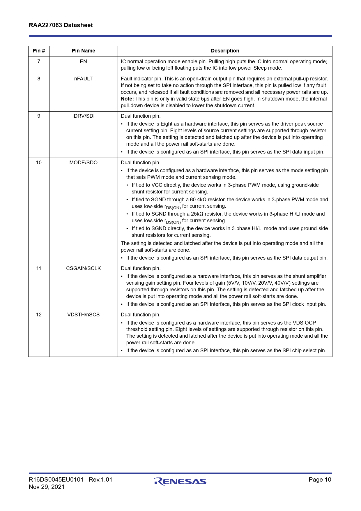 RAA227063 DatasheetPin #Pin NameDescription 7 EN IC normal operation mode enable pin. Pulling high puts the IC into normal operating mode; pulling low or being left floating puts the IC into low power Sleep mode. 8 nFAULT Fault indicator pin. This is an open-drain output pin that requires an external pull-up resistor. If not being set to take no action through the SPI interface, this pin is pulled low if any fault occurs, and released if all fault conditions are removed and all necessary power rails are up. Note: This pin is only in valid state 5µs after EN goes high. In shutdown mode, the internal pull-down device is disabled to lower the shutdown current. 9 IDRV/SDI Dual function pin. ▪ If the device is Eight as a hardware interface, this pin serves as the driver peak source current setting pin. Eight levels of source current settings are supported through resistor on this pin. The setting is detected and latched up after the device is put into operating mode and all the power rail soft-starts are done. ▪ If the device is configured as an SPI interface, this pin serves as the SPI data input pin. 10 MODE/SDO Dual function pin. ▪ If the device is configured as a hardware interface, this pin serves as the mode setting pin that sets PWM mode and current sensing mode. • If tied to VCC directly, the device works in 3-phase PWM mode, using ground-side shunt resistor for current sensing. • If tied to SGND through a 60.4kΩ resistor, the device works in 3-phase PWM mode and uses low-side rDS(ON) for current sensing. • If tied to SGND through a 25kΩ resistor, the device works in 3-phase HI/LI mode and uses low-side rDS(ON) for current sensing. • If tied to SGND directly, the device works in 3-phase HI/LI mode and uses ground-side shunt resistors for current sensing. The setting is detected and latched after the device is put into operating mode and all the power rail soft-starts are done. ▪ If the device is configured as an SPI interface, this pin serves as the SPI data output pin. 11 CSGAIN/SCLK Dual function pin. ▪ If the device is configured as a hardware interface, this pin serves as the shunt amplifier sensing gain setting pin. Four levels of gain (5V/V, 10V/V, 20V/V, 40V/V) settings are supported through resistors on this pin. The setting is detected and latched up after the device is put into operating mode and all the power rail soft-starts are done. ▪ If the device is configured as an SPI interface, this pin serves as the SPI clock input pin. 12 VDSTH/nSCS Dual function pin. ▪ If the device is configured as a hardware interface, this pin serves as the VDS OCP threshold setting pin. Eight levels of settings are supported through resistor on this pin. The setting is detected and latched after the device is put into operating mode and all the power rail soft-starts are done. ▪ If the device is configured as an SPI interface, this pin serves as the SPI chip select pin. R16DS0045EU0101 Rev.1.01 Page 10 Nov 29, 2021 Document Outline Applications Features Contents 1. Overview 1.1 Typical Application Circuits 2. Pin Information 2.1 Pin Assignments 2.2 Pin Descriptions 3. Specifications 3.1 Absolute Maximum Ratings 3.2 Thermal Information 3.3 Recommended Operating Conditions 3.4 Electrical Specifications 4. Typical Performance Curves 5. Functional Description 5.1 Modes of Operation and Power-On Sequence 5.1.1 Definitions of State of Different Modes 5.1.2 Mode Transition 5.1.3 Modes of Operation 5.1.3.1 Gate Driver Control Modes 5.1.3.2 3-phase HI/LI Mode 5.1.3.3 3-phase PWM Mode 5.1.4 Gate Driver Structure and Feature 5.1.4.1 Driver Structure 5.1.4.2 Adjustable Slew-Rate 5.1.4.3 Driver Robustness Enhancement 5.1.4.4 Gate Drive Diagram 5.1.4.5 Gate Drive Scheme in 3-phase HI/LI Mode 5.1.5 Power Architecture 5.1.5.1 Power Architecture Overview 5.1.5.2 Low-Side Driver Supply (VDRV) 5.1.5.3 Charge Pump 5.1.5.4 VCC Supply 5.1.5.5 MCU AUXVCC Supply 5.1.6 Power-On Sequence 5.2 Fault Management 5.2.1 Fault Conditions Types 5.2.2 nFAULT Indicator 5.3 Current Sensing and BEMF Sensing 5.3.1 Overview 5.3.2 Details on Different Sensing Configurations 5.3.2.1 Configuration 1 5.3.2.2 Configuration 2 5.3.2.3 Configuration 3 5.3.2.4 Configuration 4 5.3.2.5 Configuration 5 5.3.2.6 Configuration 6 5.3.2.7 Configuration 7 5.3.2.8 Configuration 8 5.3.2.9 Configuration 9 5.3.3 Structure of Amplifiers CSA, CSB, and CSC 5.3.4 BEMF Sensing Control Signal Logic 5.3.5 Multiplexer Control Signal Logic 5.3.6 Sample and Hold Timing Logic 5.3.7 Low-Side rDS(ON) Current Sensing Timing Logic 5.4 Hardware Interface for Parameter Setting 5.4.1 Parameter Setting Tables 5.5 Serial Peripheral Interface (SPI) 5.5.1 Communication Protocol 5.5.2 Timing Diagram 6. Register Map 7. Package Outline Drawing 8. Ordering Information 9. Revision History