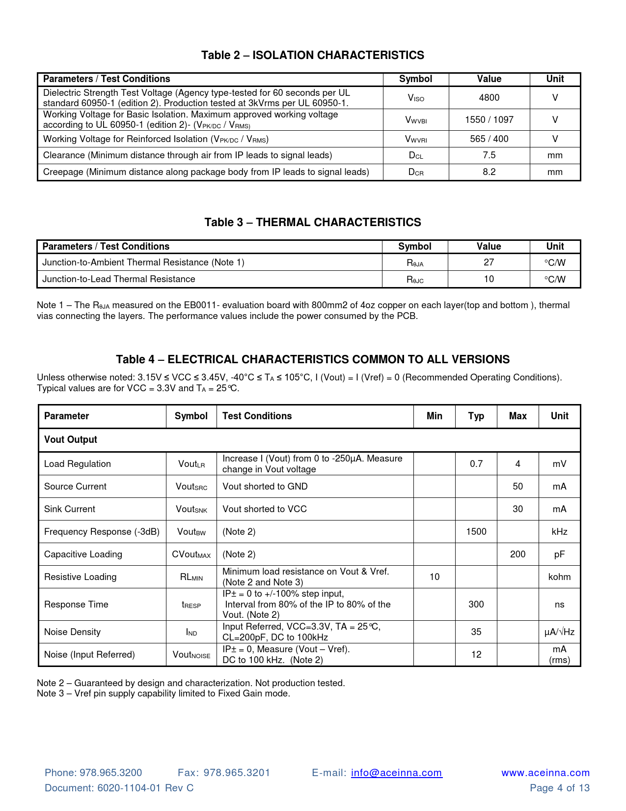 Table 2 –ISOLATION CHARACTERISTICSParameters / Test ConditionsSymbolValueUnit Dielectric Strength Test Voltage (Agency type-tested for 60 seconds per UL V standard 60950-1 (edition 2). Production tested at 3kVrms per UL 60950-1. ISO 4800 V Working Voltage for Basic Isolation. Maximum approved working voltage V according to UL 60950-1 (edition 2)- (V WVBI 1550 / 1097 V PK/DC / VRMS) Working Voltage for Reinforced Isolation (VPK/DC / VRMS) VWVRI 565 / 400 V Clearance (Minimum distance through air from IP leads to signal leads) DCL 7.5 mm Creepage (Minimum distance along package body from IP leads to signal leads) DCR 8.2 mm Table 3 –THERMAL CHARACTERISTICSParameters / Test ConditionsSymbolValueUnit Junction-to-Ambient Thermal Resistance (Note 1) RJA 27 C/W Junction-to-Lead Thermal Resistance RJC 10 C/W Note 1 – The RJA measured on the EB0011- evaluation board with 800mm2 of 4oz copper on each layer(top and bottom ), thermal vias connecting the layers. The performance values include the power consumed by the PCB. Table 4 – ELECTRICAL CHARACTERISTICS COMMON TO ALL VERSIONS Unless otherwise noted: 3.15V ≤ VCC ≤ 3.45V, -40°C ≤ TA ≤ 105°C, I (Vout) = I (Vref) = 0 (Recommended Operating Conditions). Typical values are for VCC = 3.3V and TA = 25°C. ParameterSymbolTest ConditionsMinTypMaxUnitVout Output Increase I (Vout) from 0 to -250µA. Measure Load Regulation VoutLR 0.7 4 mV change in Vout voltage Source Current VoutSRC Vout shorted to GND 50 mA Sink Current VoutSNK Vout shorted to VCC 30 mA Frequency Response (-3dB) VoutBW (Note 2) 1500 kHz Capacitive Loading CVoutMAX (Note 2) 200 pF Minimum load resistance on Vout & Vref. Resistive Loading RLMIN 10 kohm (Note 2 and Note 3) IP± = 0 to +/-100% step input, Response Time tRESP Interval from 80% of the IP to 80% of the 300 ns Vout. (Note 2) Input Referred, VCC=3.3V, TA = 25°C, Noise Density IND 35 µA/Hz CL=200pF, DC to 100kHz IP± = 0, Measure (Vout – Vref). mA Noise (Input Referred) VoutNOISE 12 DC to 100 kHz. (Note 2) (rms) Note 2 – Guaranteed by design and characterization. Not production tested. Note 3 – Vref pin supply capability limited to Fixed Gain mode. Phone: 978.965.3200 Fax: 978.965.3201 E-mail: info@aceinna.com www.aceinna.com Document: 6020-1104-01 Rev C Page 4 of 13